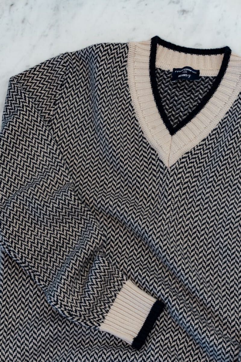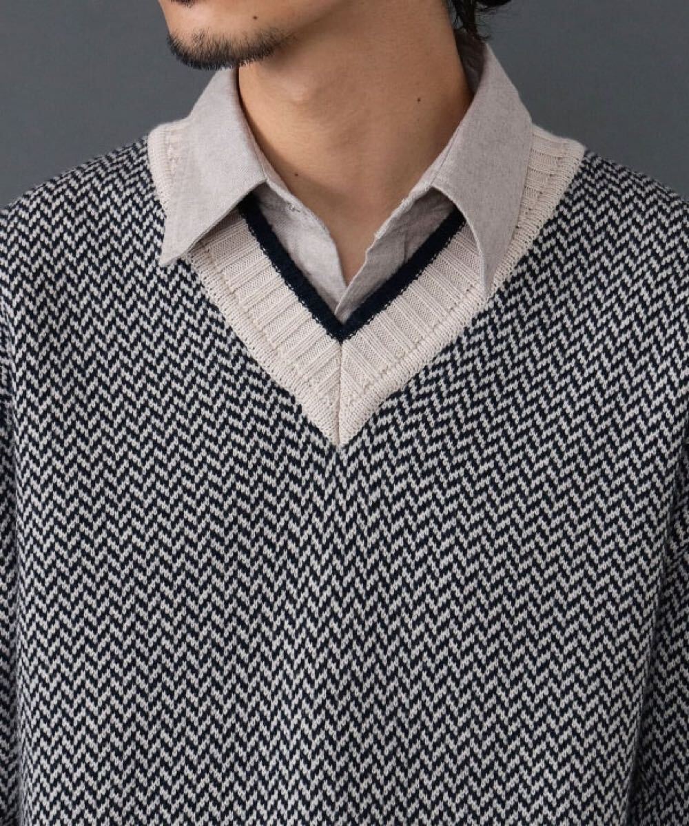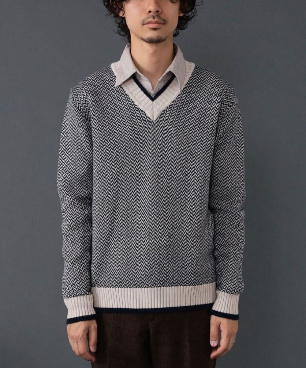 MORGANO ヘリンボーン Vネックニット 24AW ネイビー BEAMS F