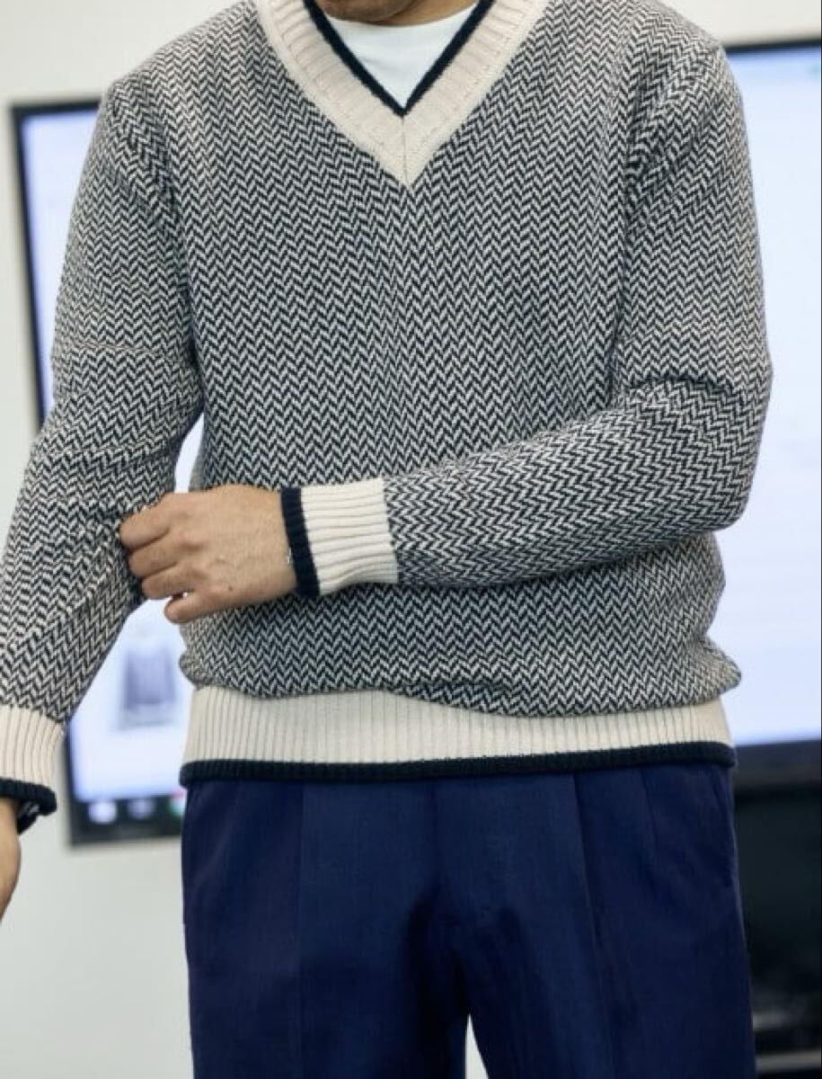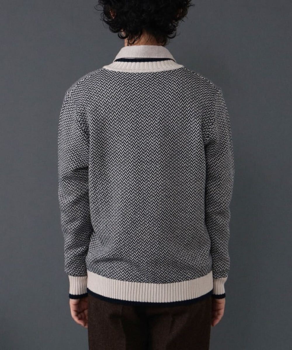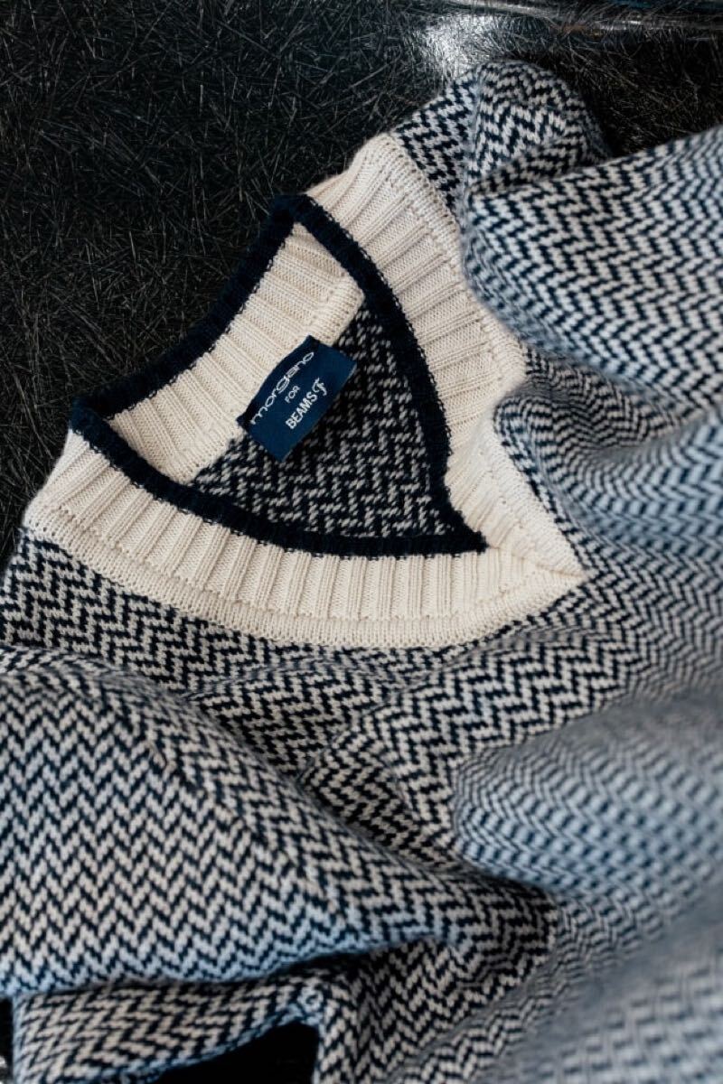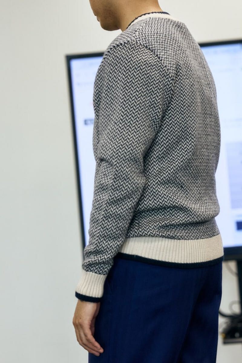 今回別注したのはボディがヘリンボーンのチルデンセーター。ミドルゲージでやや肉厚、インナー使いはもちろんこちらをトップスとして着用するのにもちょうど良いバランスです。