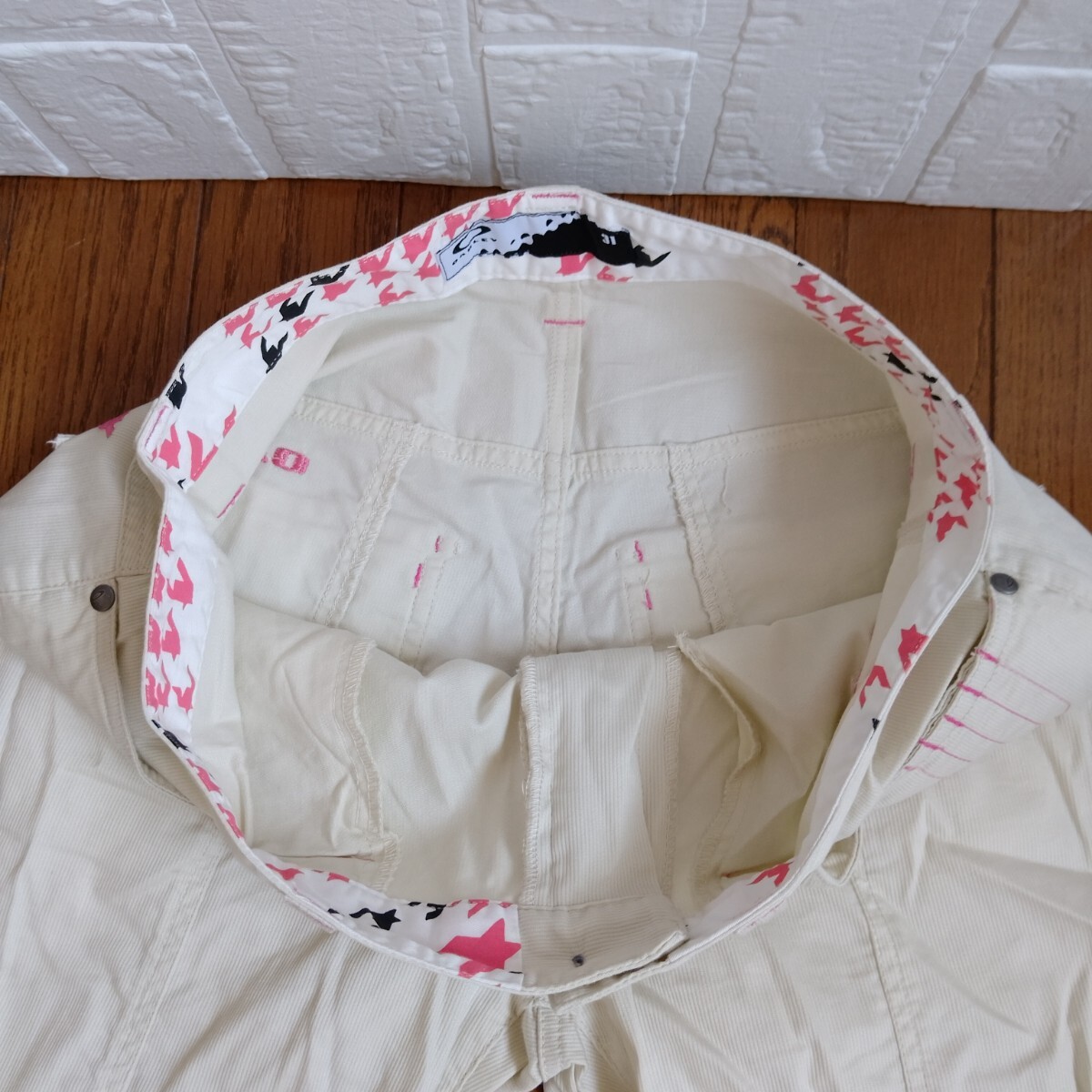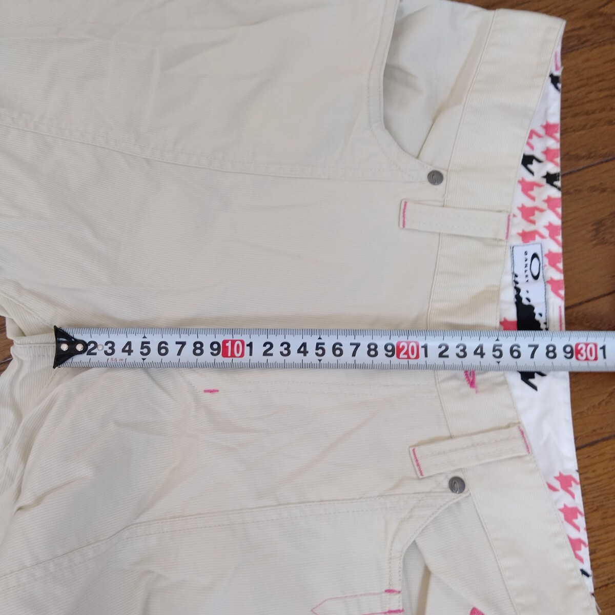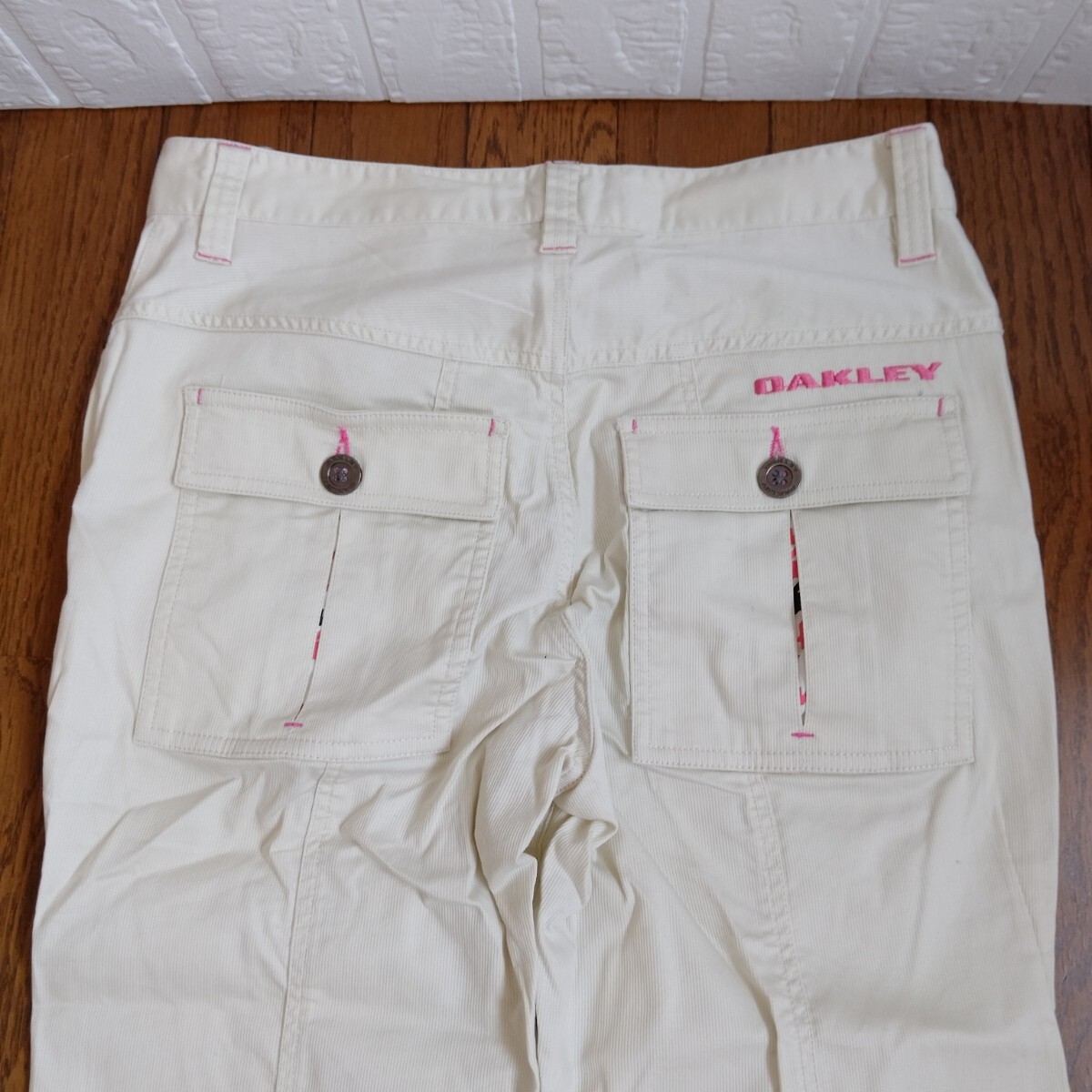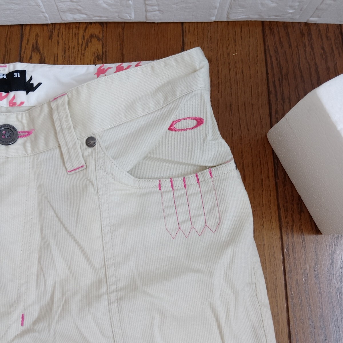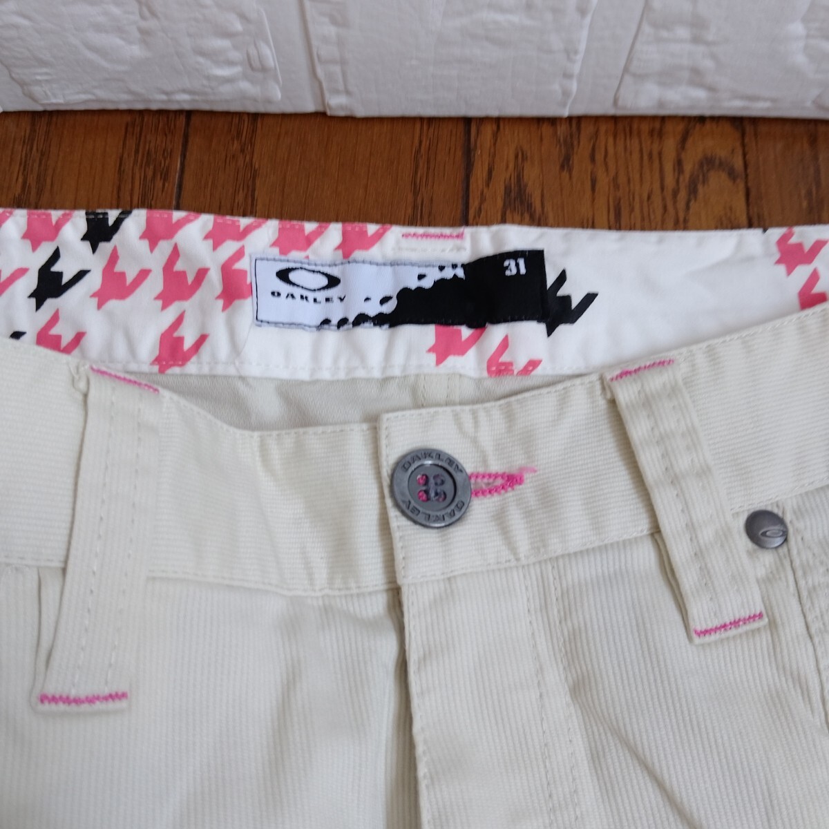ベージュ/ピンク、ウエスト内側にピンクと黒の幾何学模様、止め糸はピンク、前ポケット2つ、左前ポケット上に『OAKLEY』ののピンクの刺繍、後ポケット蓋付き2つ、右後ポケット上に『OAKLEY』のピンクのロゴ刺繍がデザインされています。