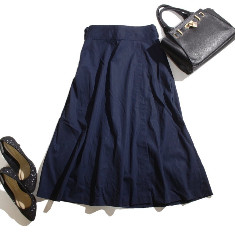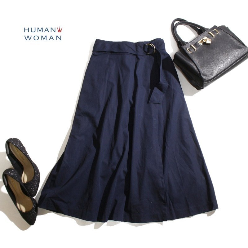 美品 ヒューマンウーマン HUMAN WOMAN コットン ベルト一体 シンプル ミディ Aライン フレアスカート M ネイビー 紺 ストレッチ ハリ
