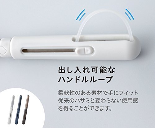 出し入れ可能なハンドルループは柔軟性のある素材で手にフィットし、従来のハサミと変わらない使用感。