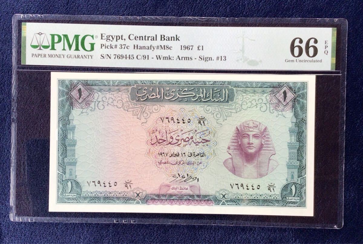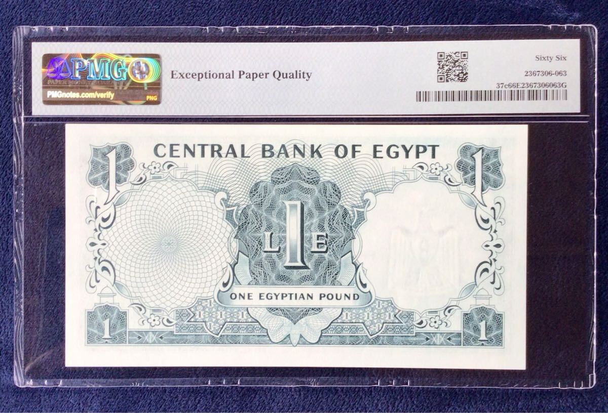 エジプト《中央銀行》1ポンド【1967】『PMGグレーディング鑑定 未使用 66 EPQ』