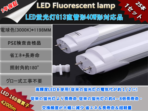 25本1セット 高輝度LED168チップ4200LM直管型LED蛍光灯G13/40W形120cm対応品/電球色3000K/発光180° グロー式工事不要/ 1年保証