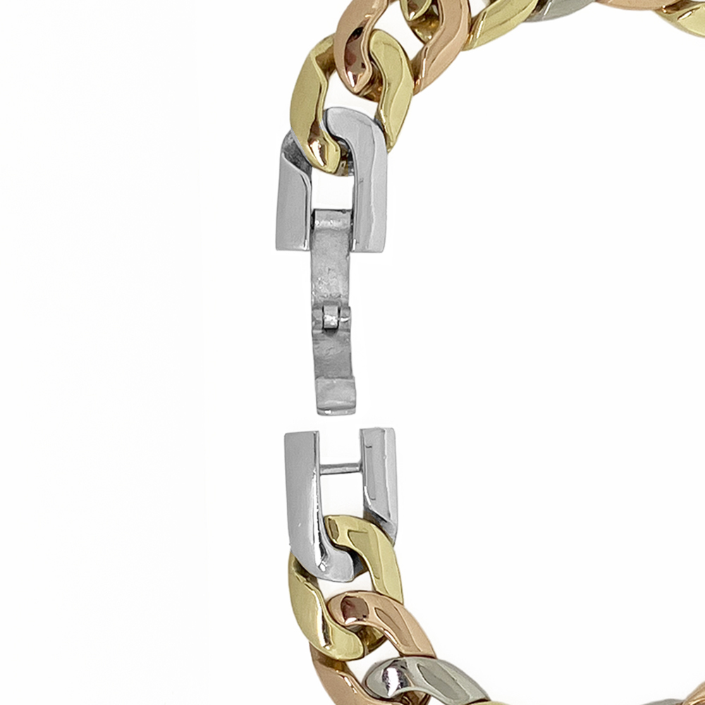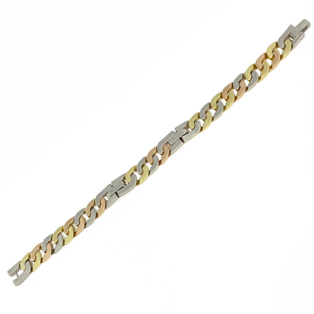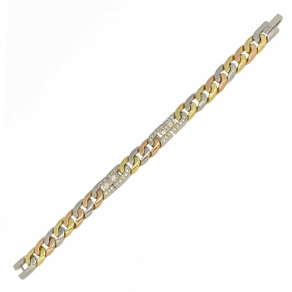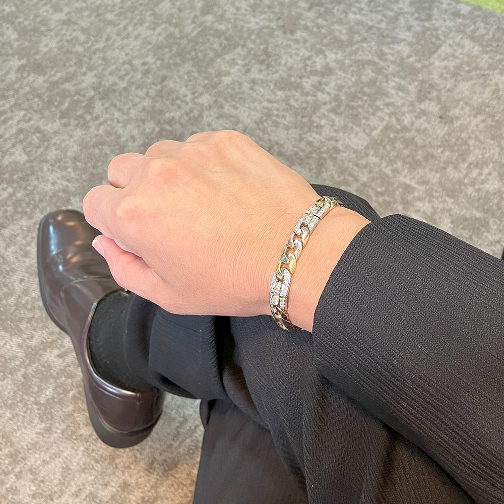 コメント | K18 Pt850 ダイヤ 3色カラー メンズ ブレスレット が入荷しました。プラチナとイエロー・ピンクゴールドを使用した3色カラーのブレスレットに良質で無色透明に近いダイヤモンドが輝く豪華なブレスレットです。 ~出品担当の山本より~ 装着すると、ちょうど良いサイズで着け心地がなめらかです。プラチナとゴールドのコントラストとダイヤの輝きが手元をおしゃれに演出してくれます。 | ||