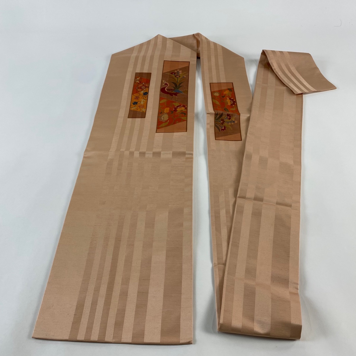 | 名古屋帯 秀品 紬地 短冊 花鳥 薄ピンク 正絹 【中古】 |