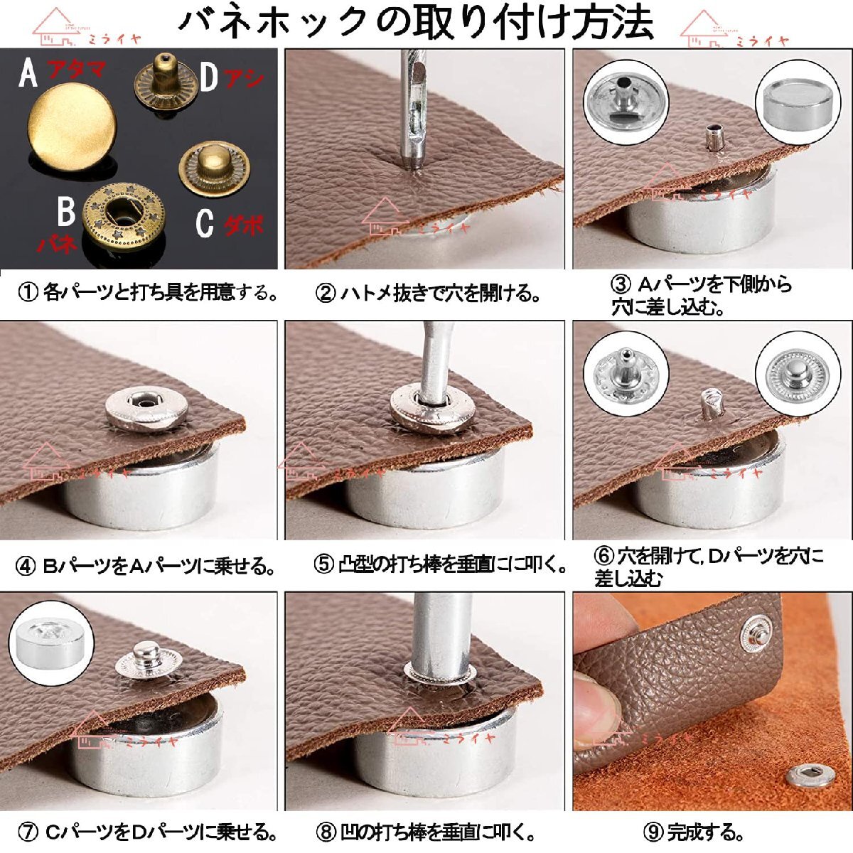 ブランド:ミライヤカラー:マルチカラーサイズ:ブロンズ色12mm【セット内容】:ホック仕様:バネホック12mm×15組 633#12mm用x2本 ハトメ抜きx1本 打ち台1個