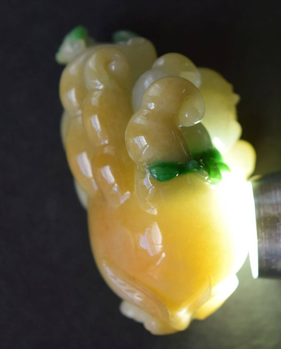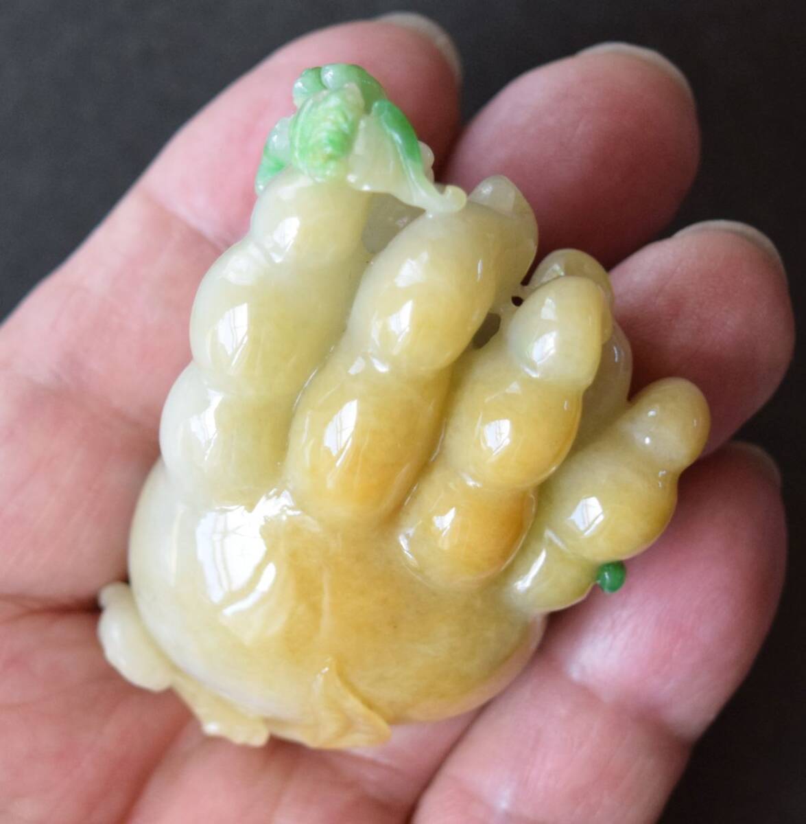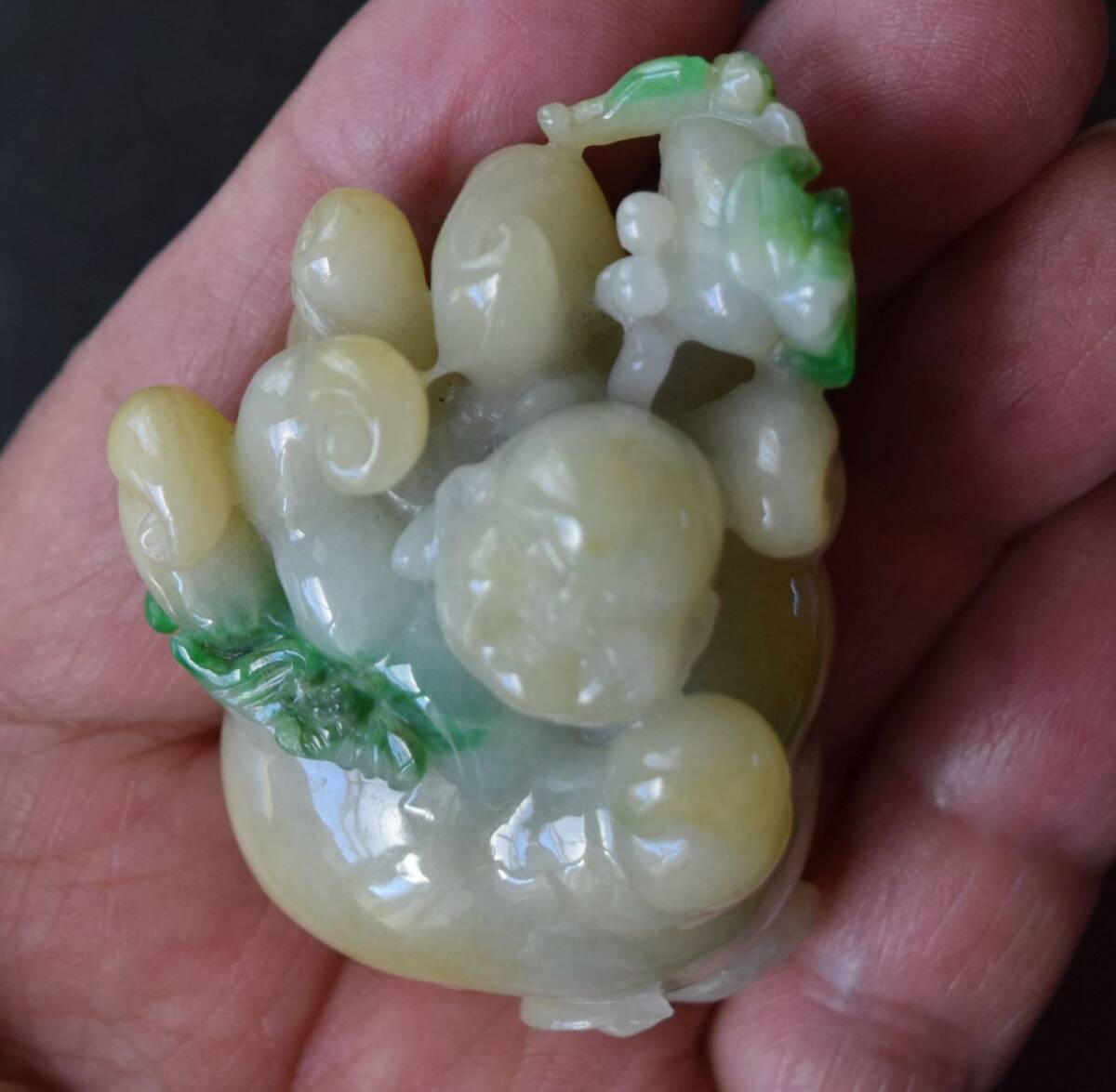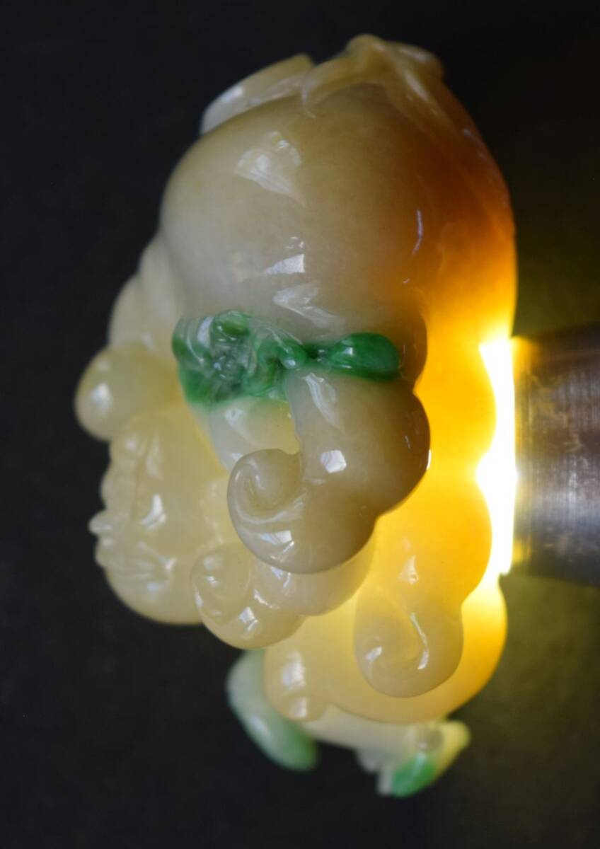 1.天然石卸、超激レア、完全別格品、翡翠布袋様彫物、イエローにグリーンが映えて見映えもよく握り石にも。