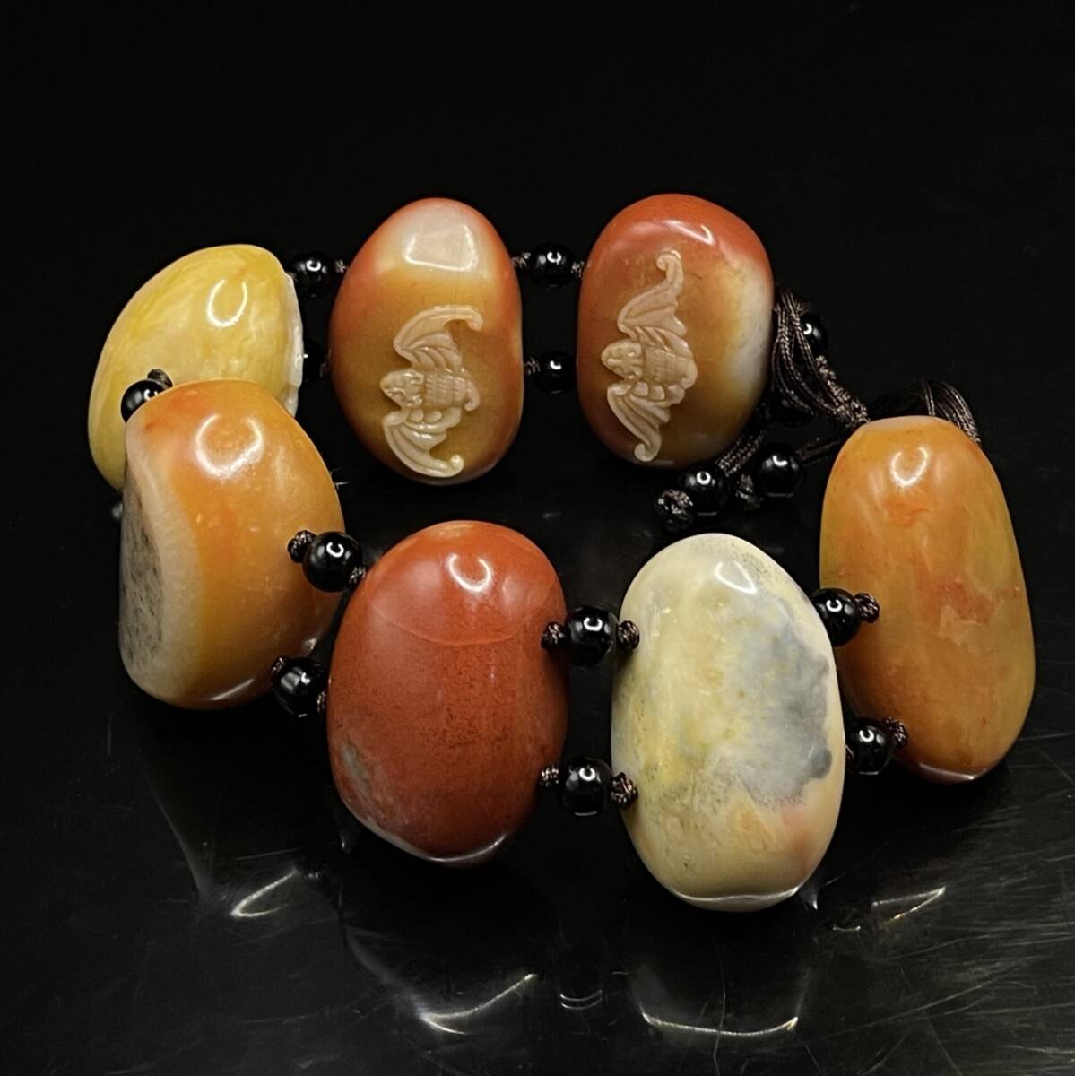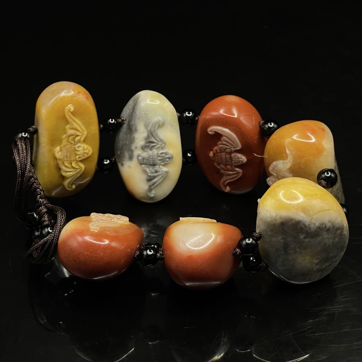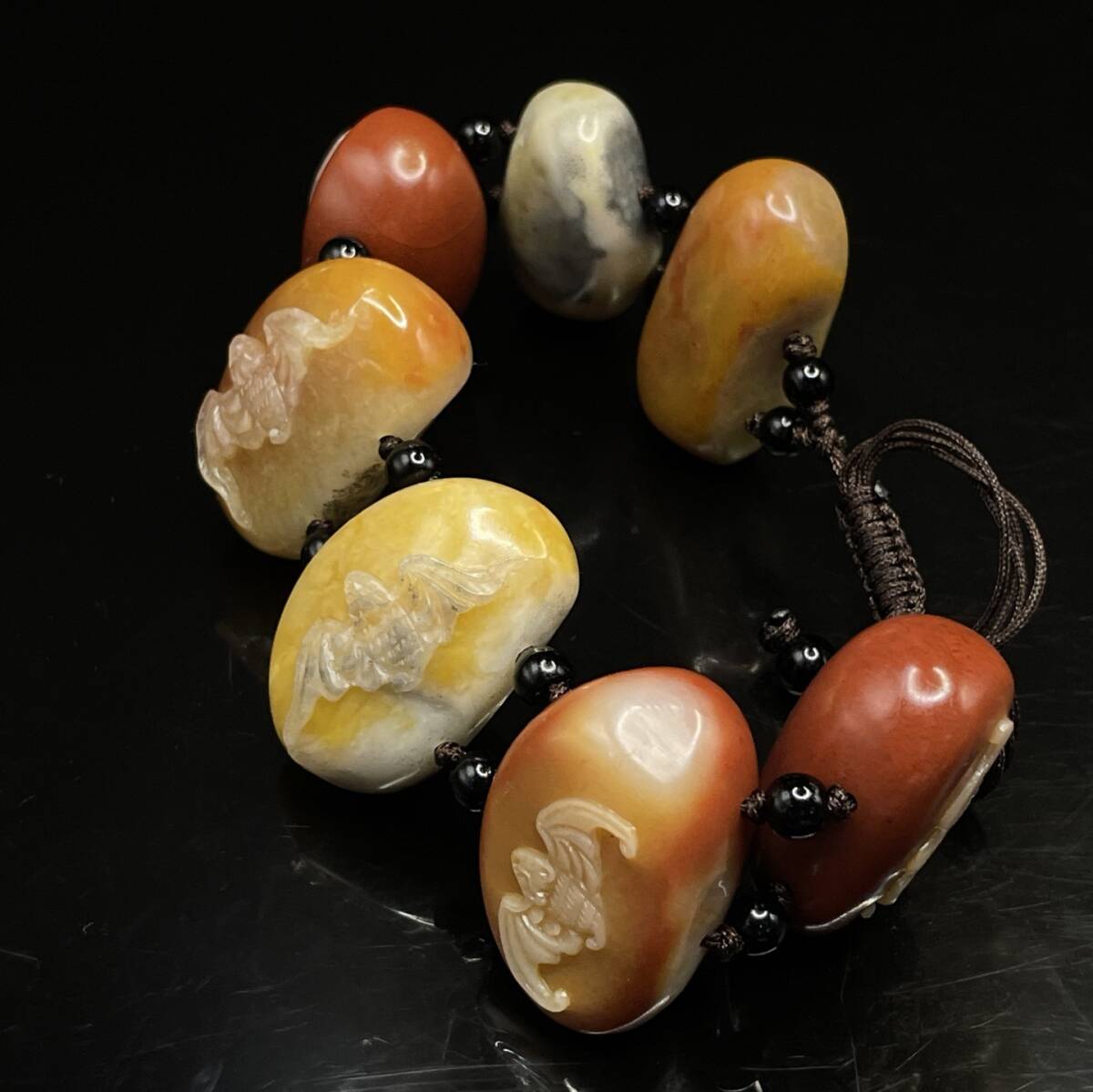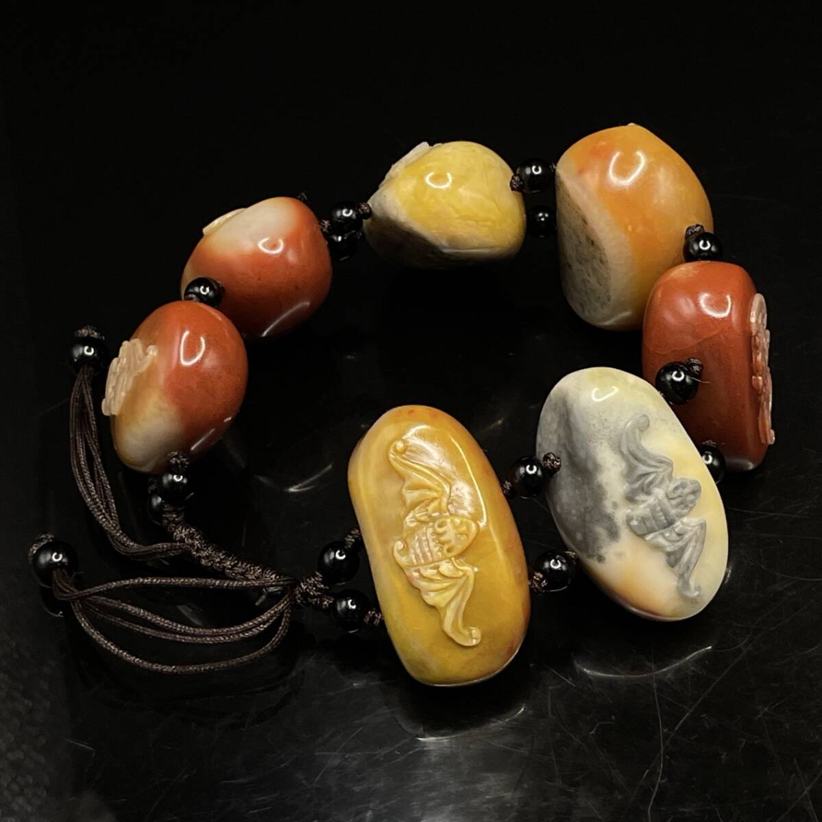 唐物 清 寿山石 田黄級 芙蓉石 手鏈【福在眼前】石質温潤細膩 天然石 手彫 篆刻 極細工 古美術品 時代物 中国古玩 骨董品 D67