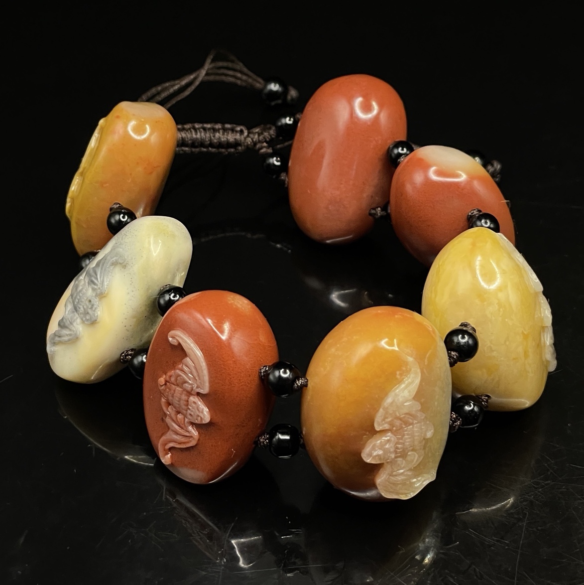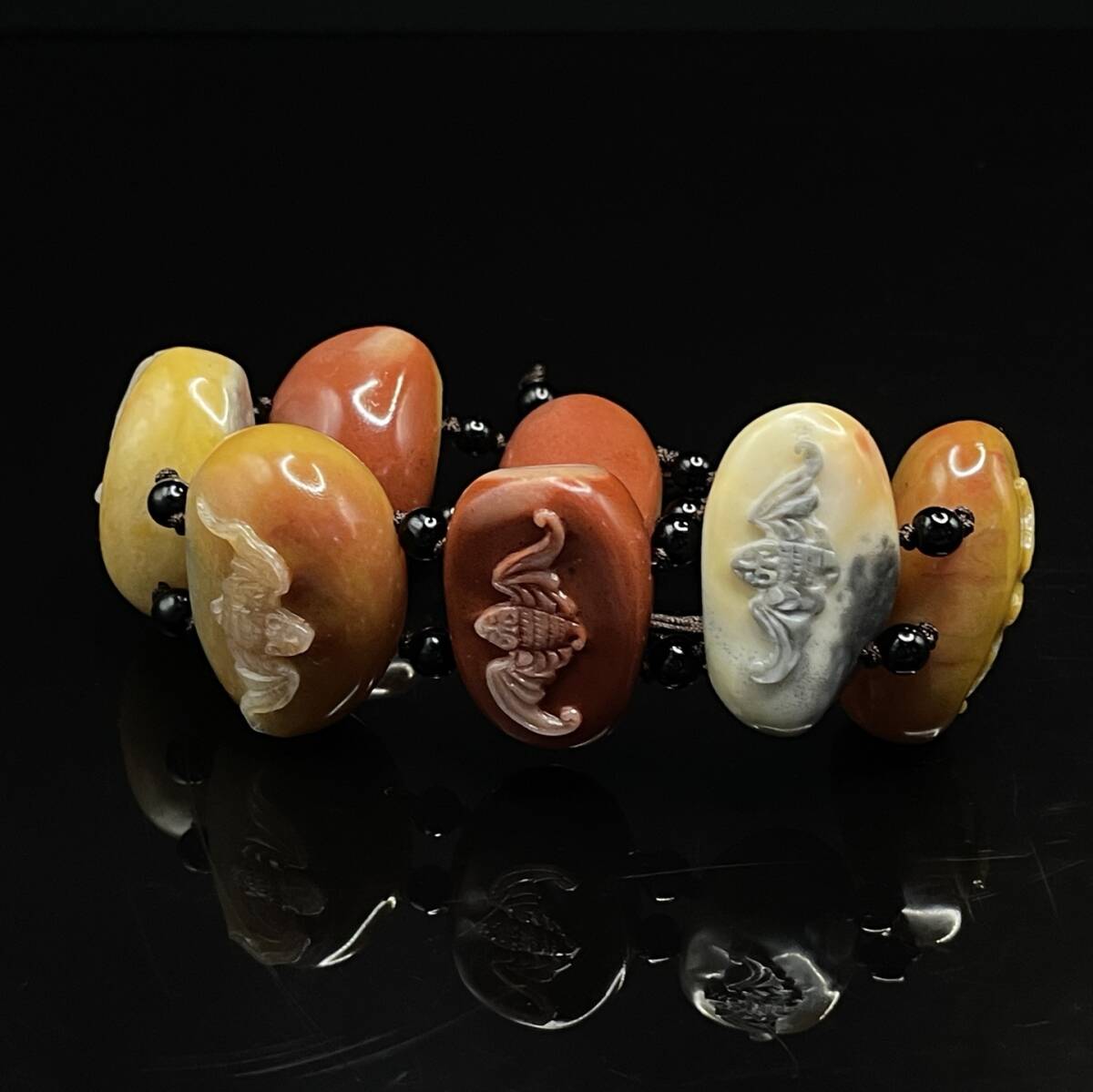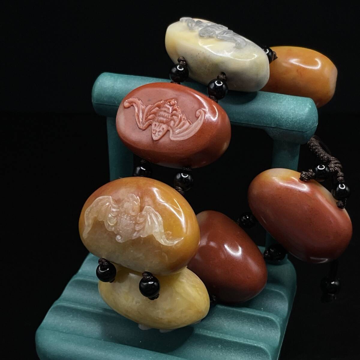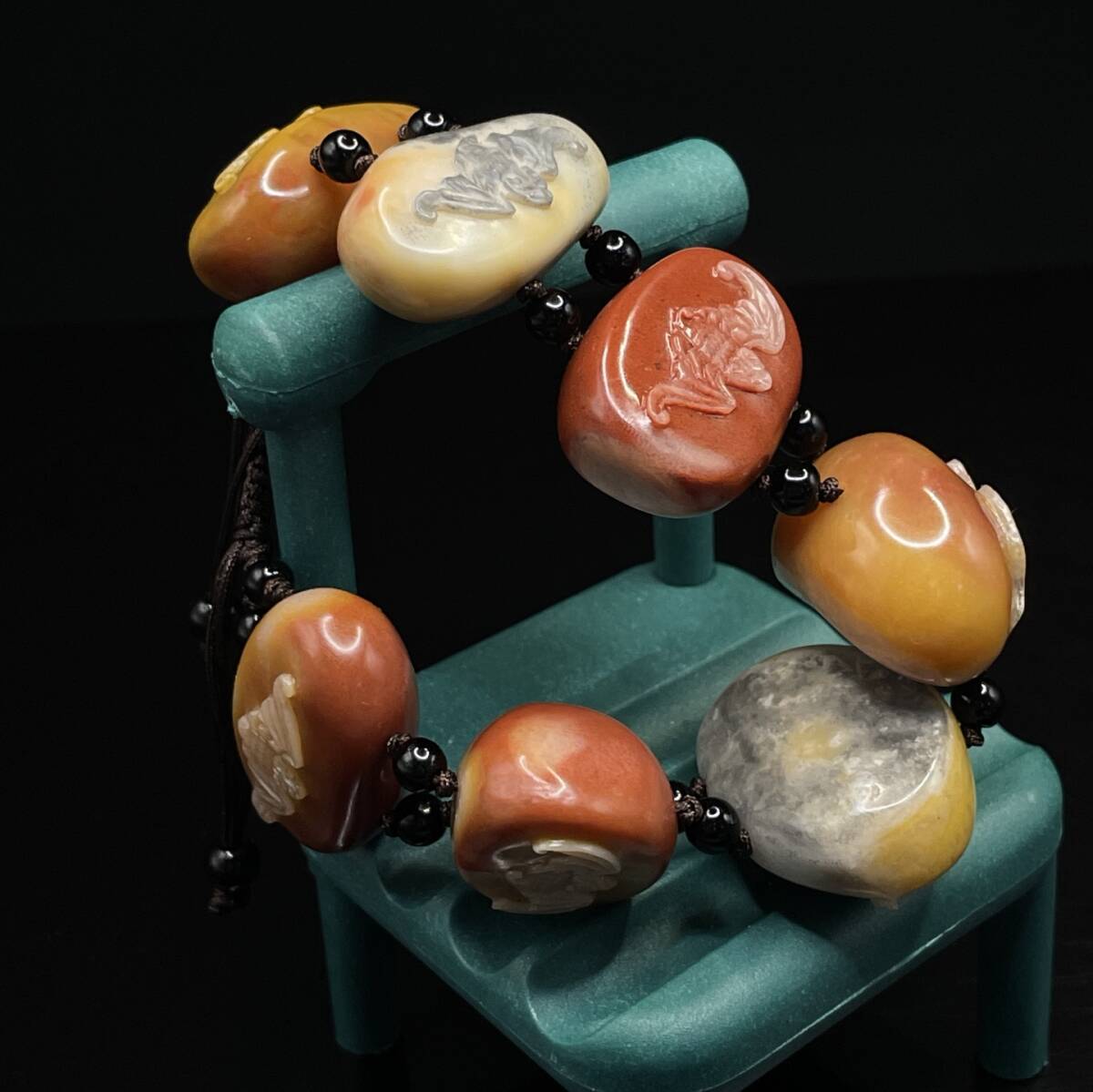 唐物 清 寿山石 田黄級 芙蓉石 手鏈【福在眼前】石質温潤細膩 天然石 手彫 篆刻 極細工 古美術品 時代物 中国古玩 骨董品 D67