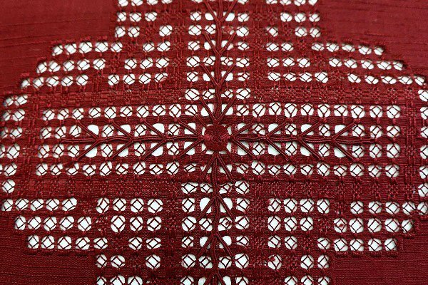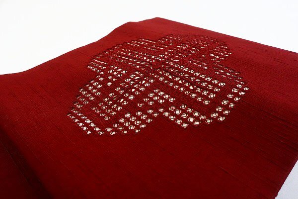 栗色の紬地に、十字文様がドロンワークで施された名古屋帯です。 ドロンワークの刺繍によって抜かれた隙間から裏地が透けて見える様子が、お洒落で素敵な一本です。 未使用品です。 担当:前田 |