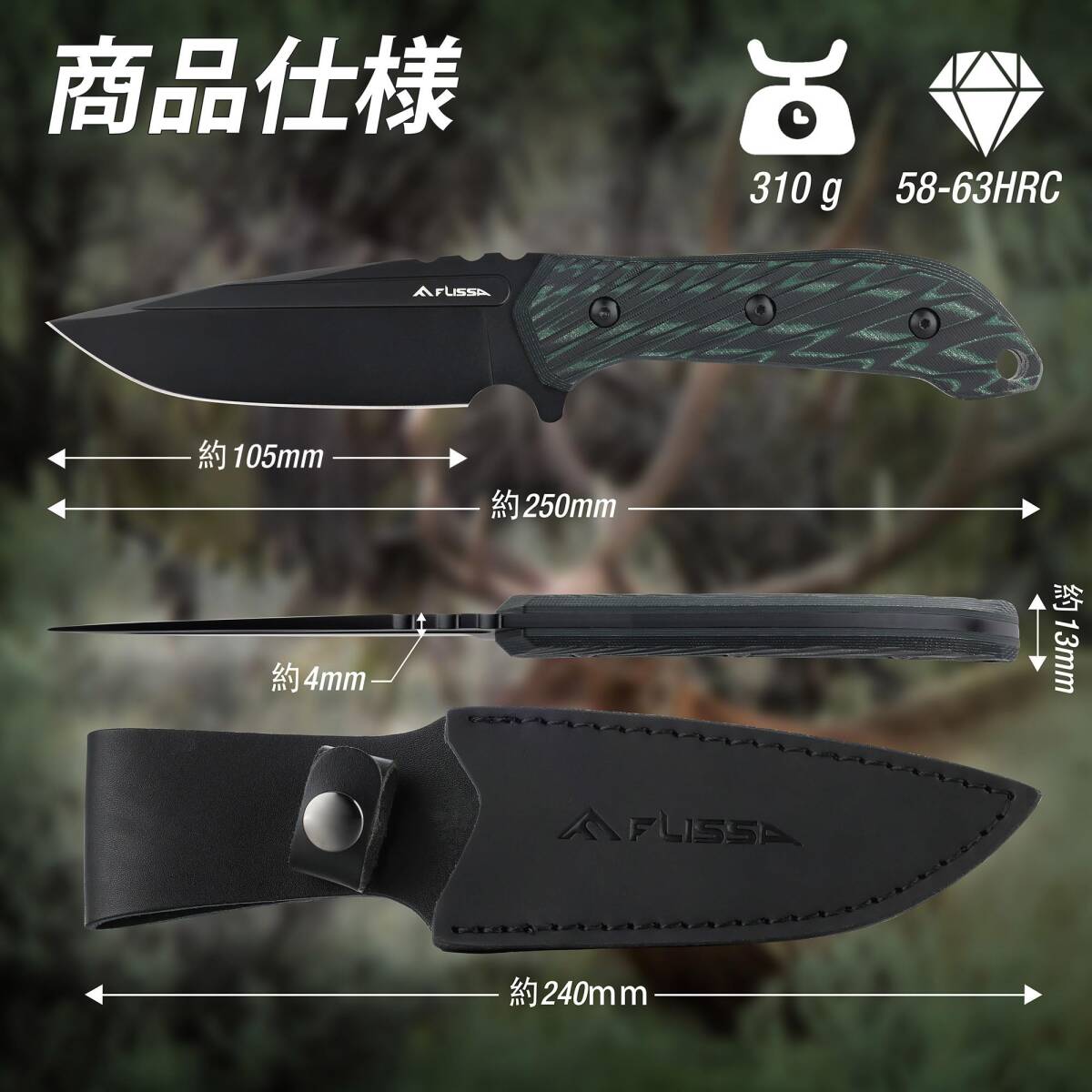 【仕様】 全長約250mm、刃長約105mm。刃厚:約4mm。重量:310g。ブレード素材:D2鋼を採用して、耐食やサビに強く、耐久性にも非常に優れております。