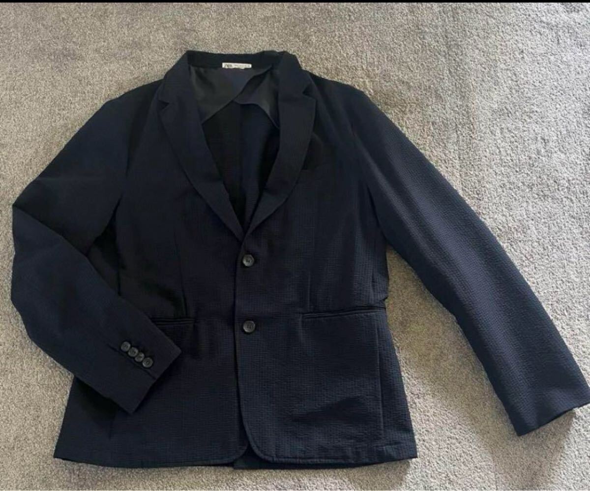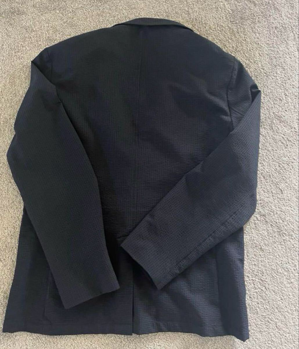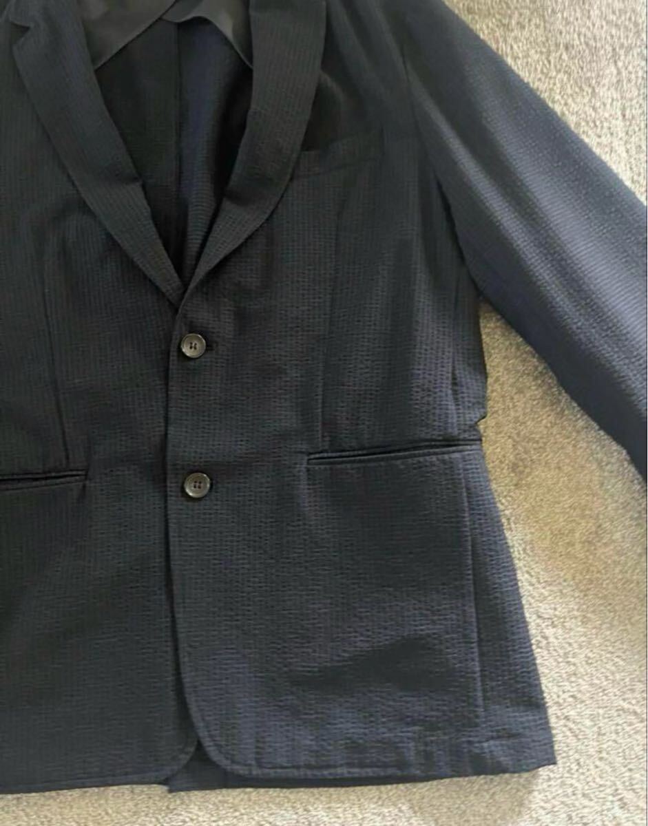 テクスチャーのあるネイビーのテーラードジャケット、2つボタン、前にポケット付き。