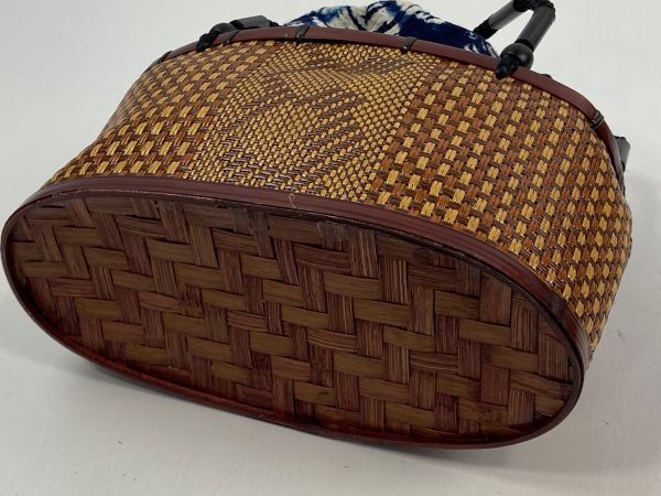 <素 材>巾着部分 綿100%  籠部分 竹、合皮 持ち手 ポリ紐、木製