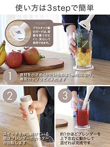 プラスチック製のガードは、容器を傷つけにくく、安心して使用できます。付属品の専用カップの底には、シリコン製の滑り止めがついています。dretec(ドリテック)のハンドブレンダーは手に取っていただく全てのお客様に使いさすさと安心をご提供します。