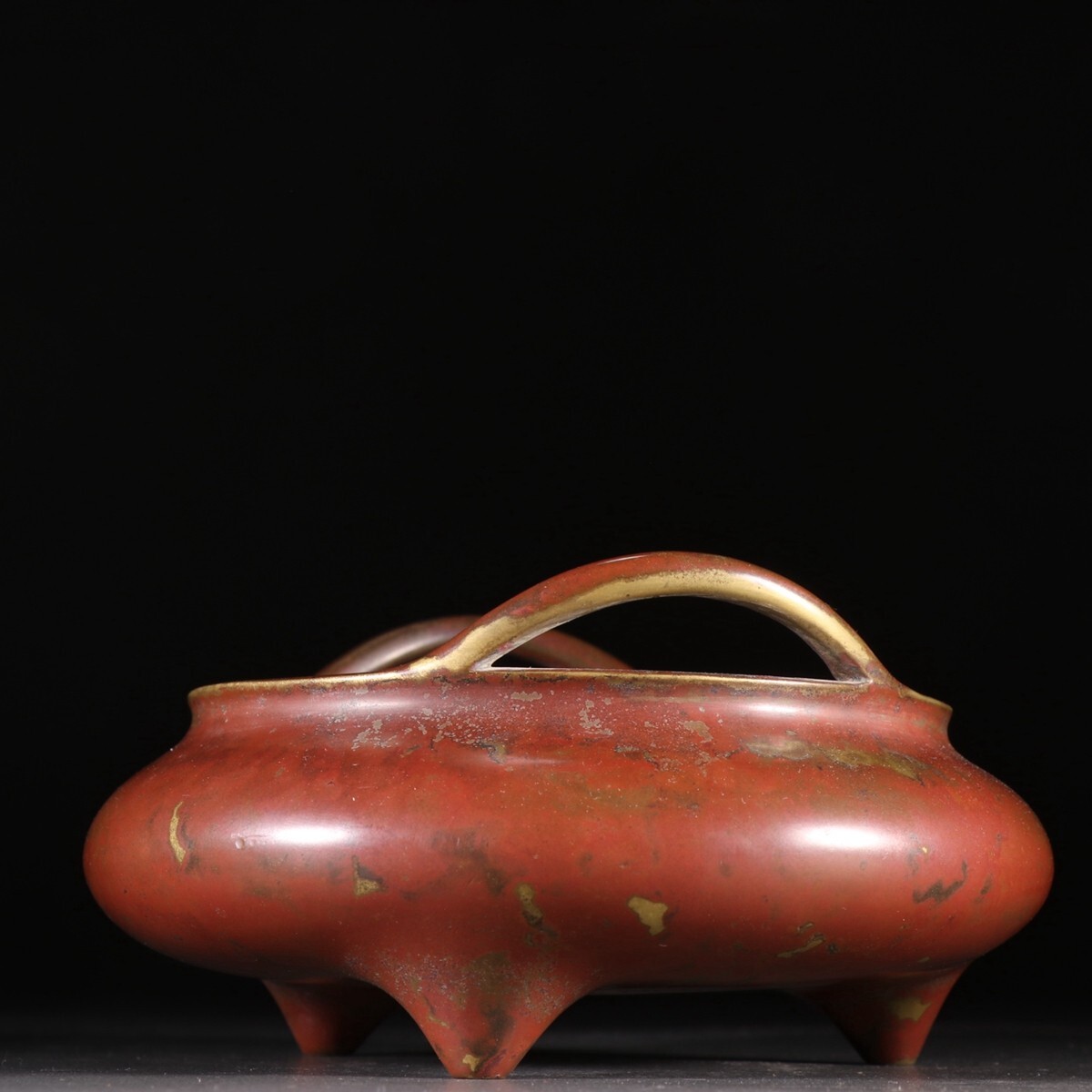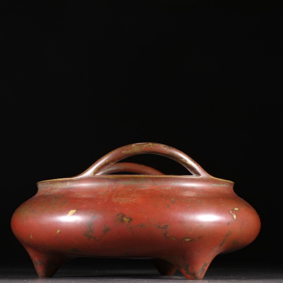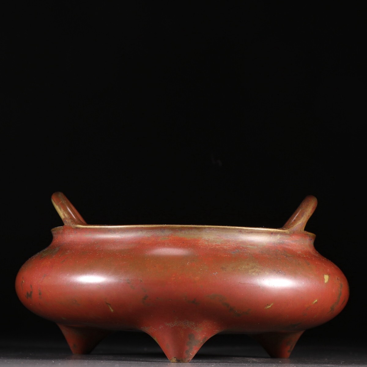「明代 大明宣徳年製 古銅彫 棗皮紅 三足橋耳老銅香炉」旧銅器 置物擺件 賞物 中国古美術 旧蔵出