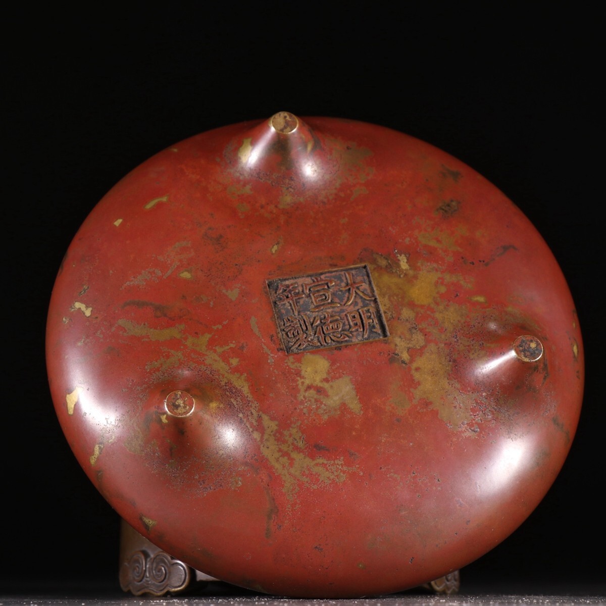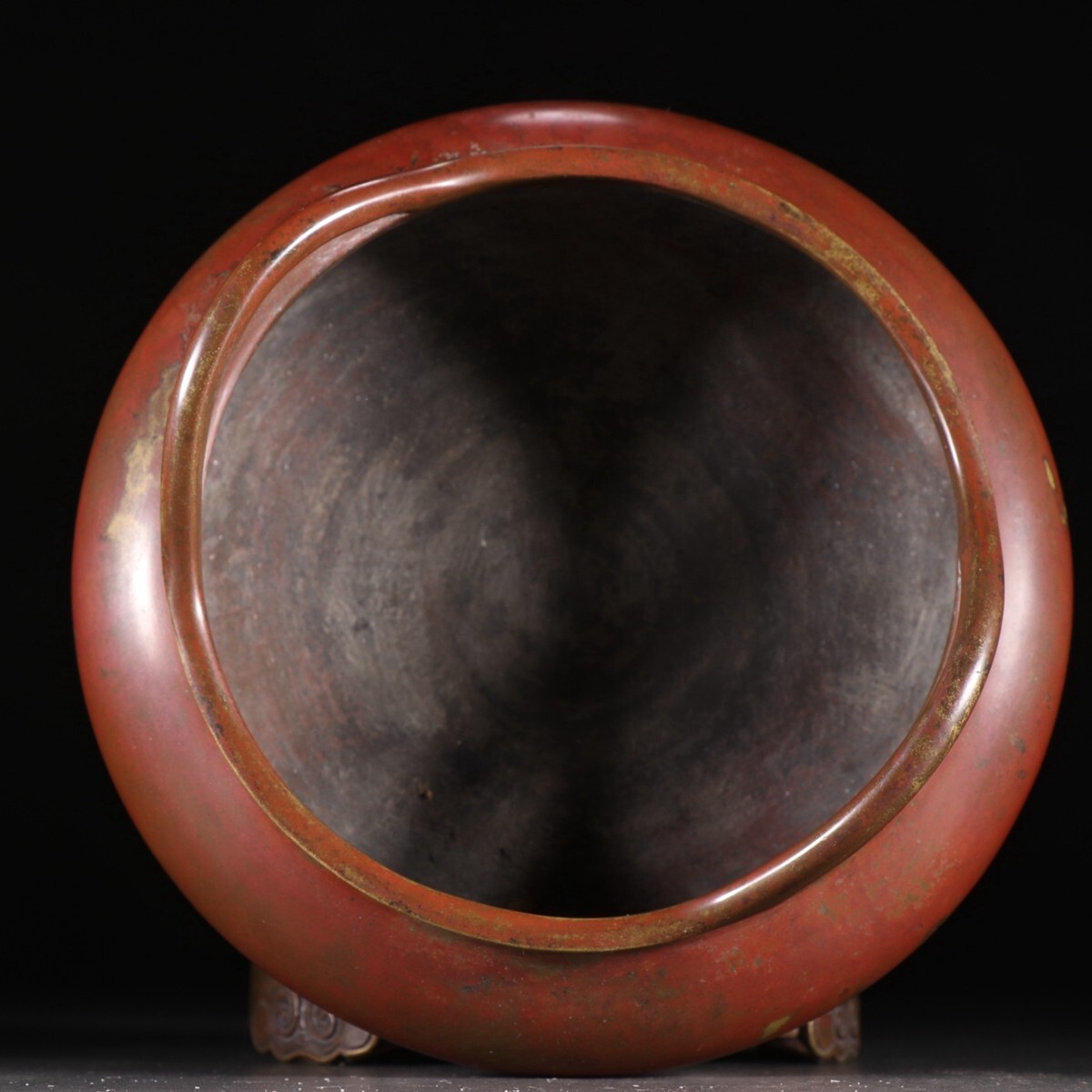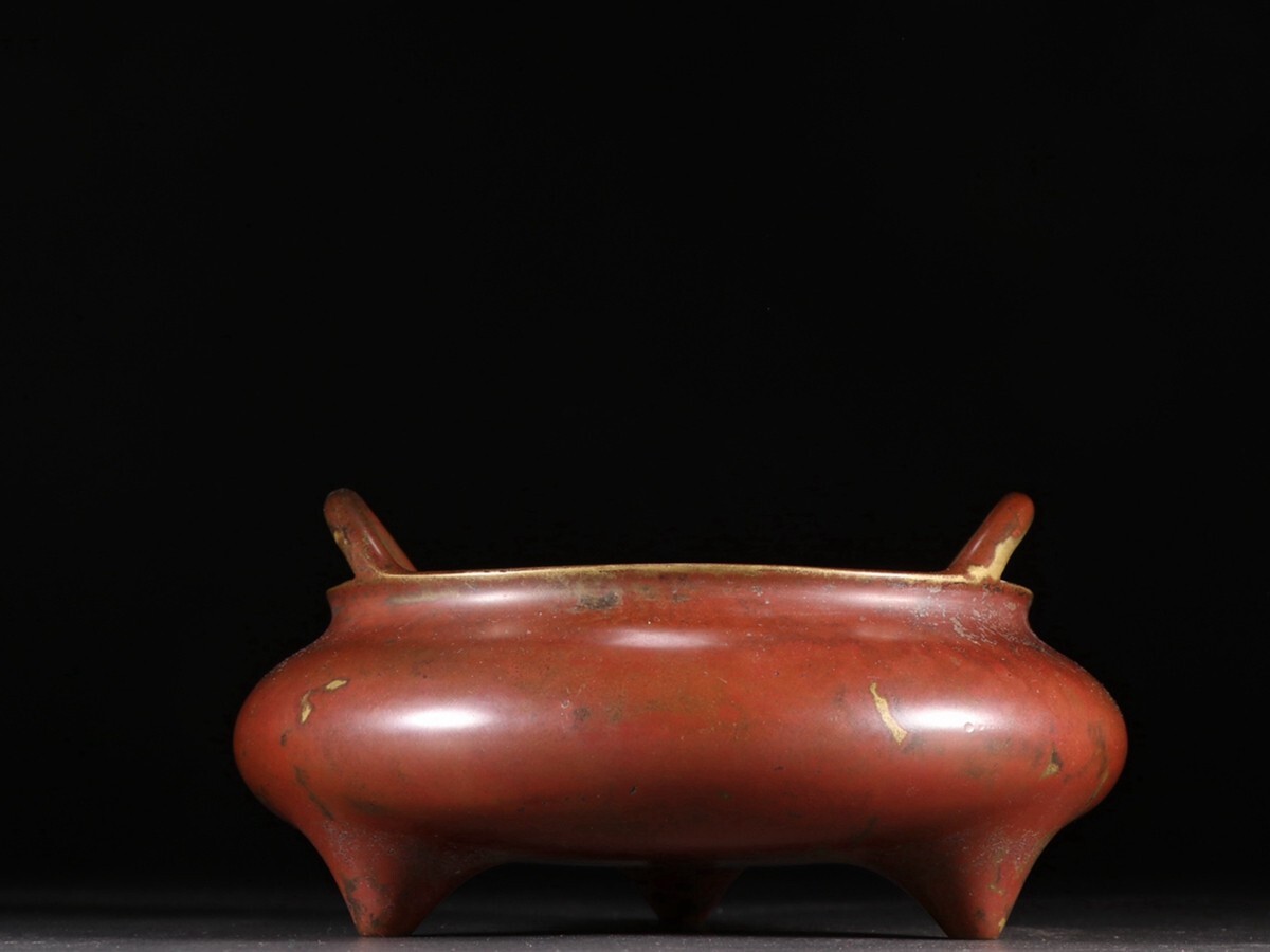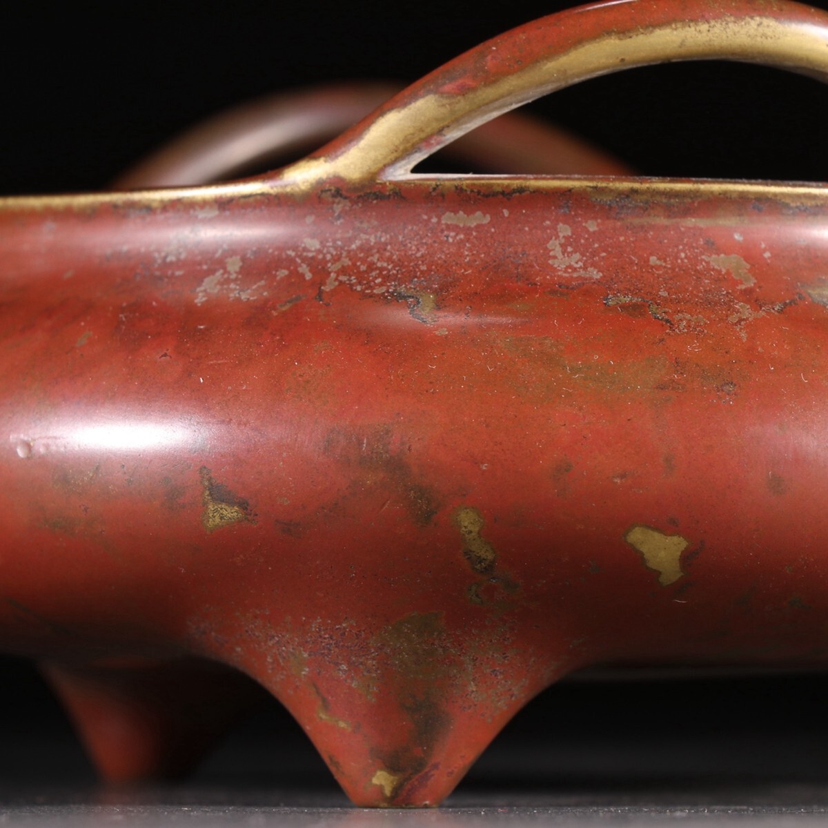 「明代 大明宣徳年製 古銅彫 棗皮紅 三足橋耳老銅香炉」旧銅器 置物擺件 賞物 中国古美術 旧蔵出