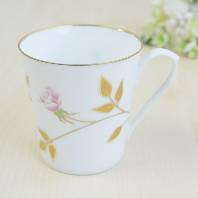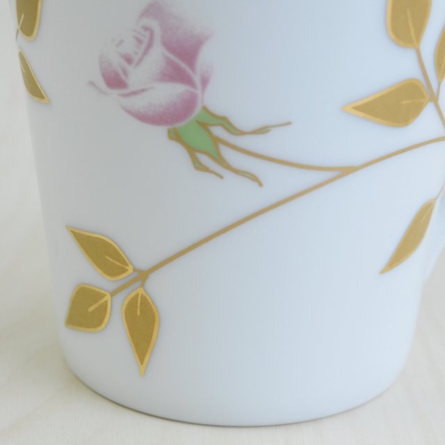 華やかな金彩の葉とピンクバラが描かれたデザインは、優雅なお茶の時間をお楽しみいただけます。バラはピンク色のグラデーションで、葉は金彩で表現しました。カップは軽く、且つ掴みやすい形状です。