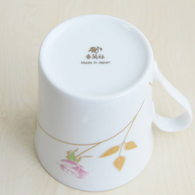 有田焼の特徴でもある透き通るような真っ白なカップに香蘭社の代表的なデザイン「薔薇」を絵付けした可憐なマグカップです。