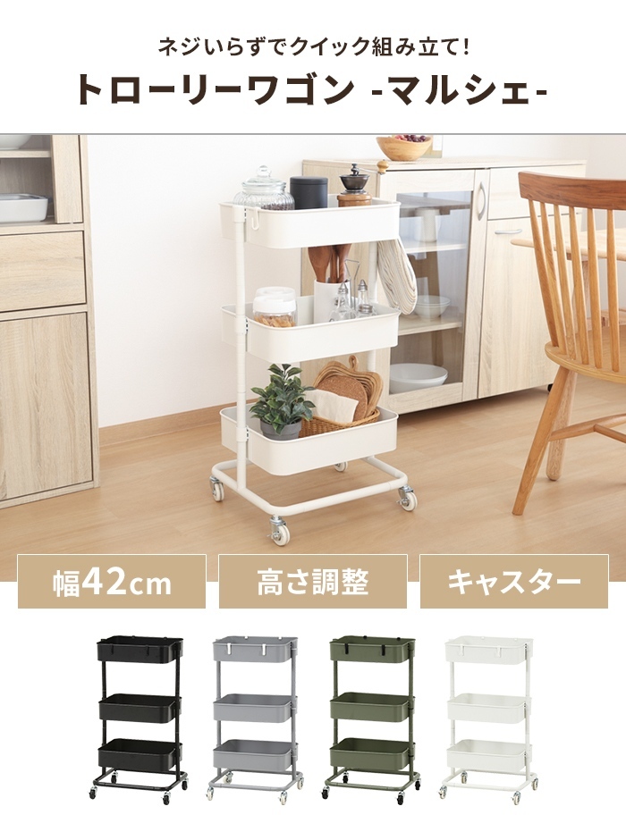 ネジいらずでクイック組み立て! バスケットの高さを調整できるトローリーワゴン。 |