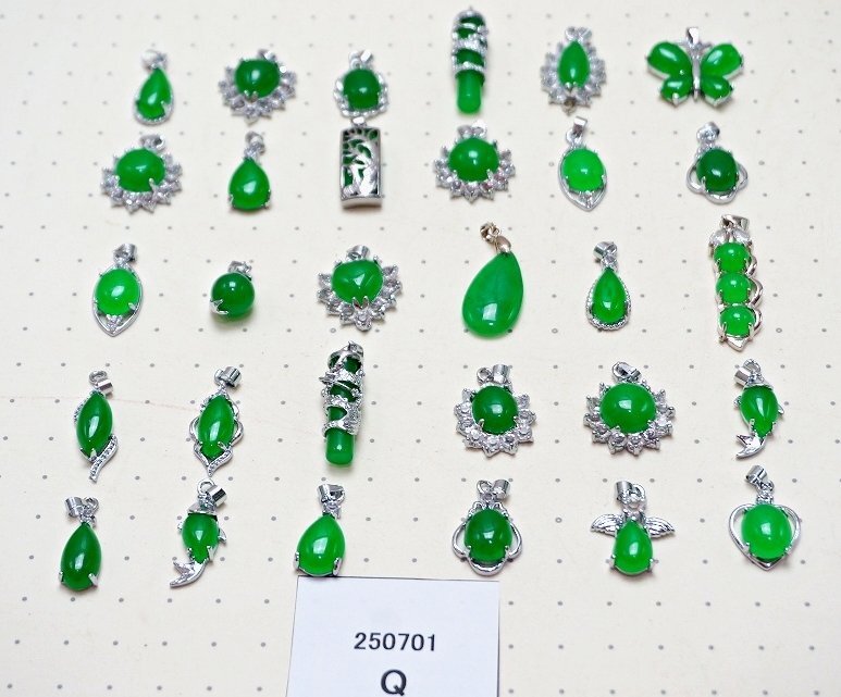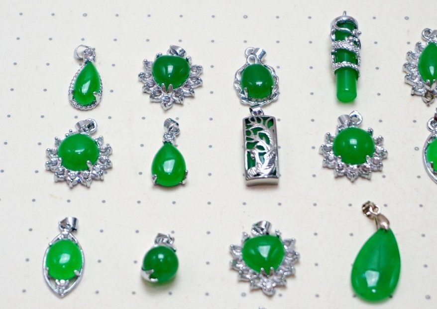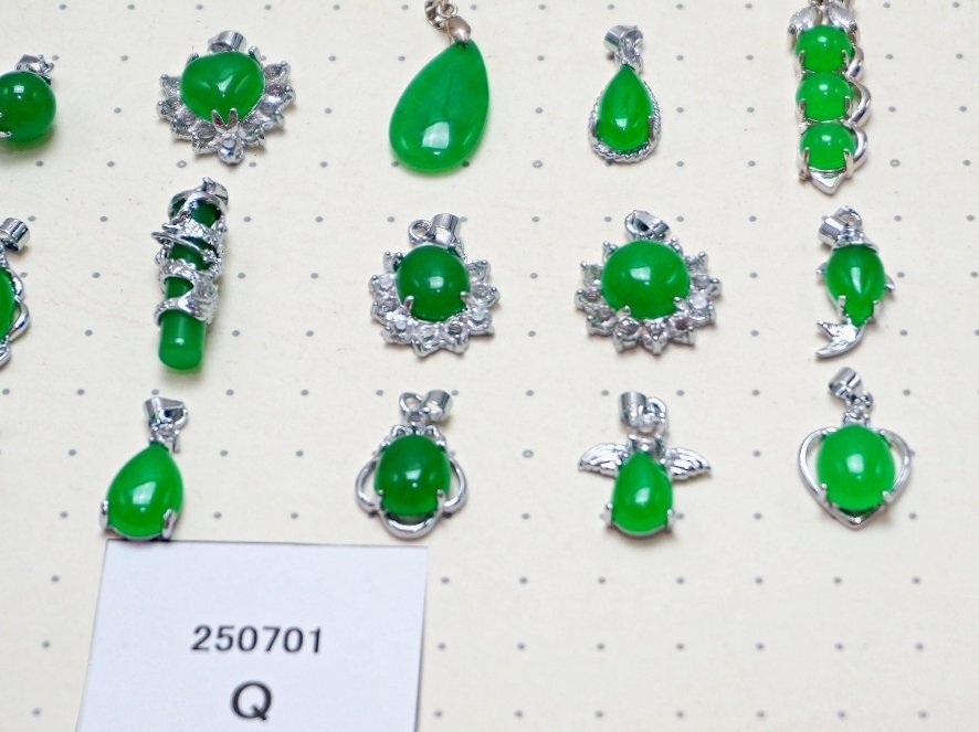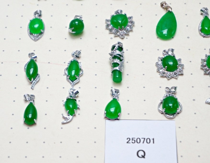 天然 緑石 ペンダントトップ まとめて30点セット 天然石のペンダントトップ 30点セットです。 とても丁寧に研磨されており、艶、色味ともに非常に美しいものです。 写真がお譲りする商品の全てになります。 材質: メノウ 玉髄 マレー翡翠 等の天然石 サイズ: ペンダントトップが置かれている下地の模様の点の間隔が1cmですので、参考にしてください。 個数: 30点 当店の他の出品商品との同梱料は下記のとおり落札1点につき200円です。 |