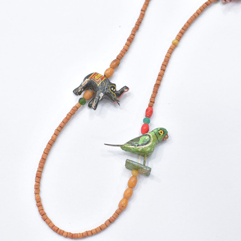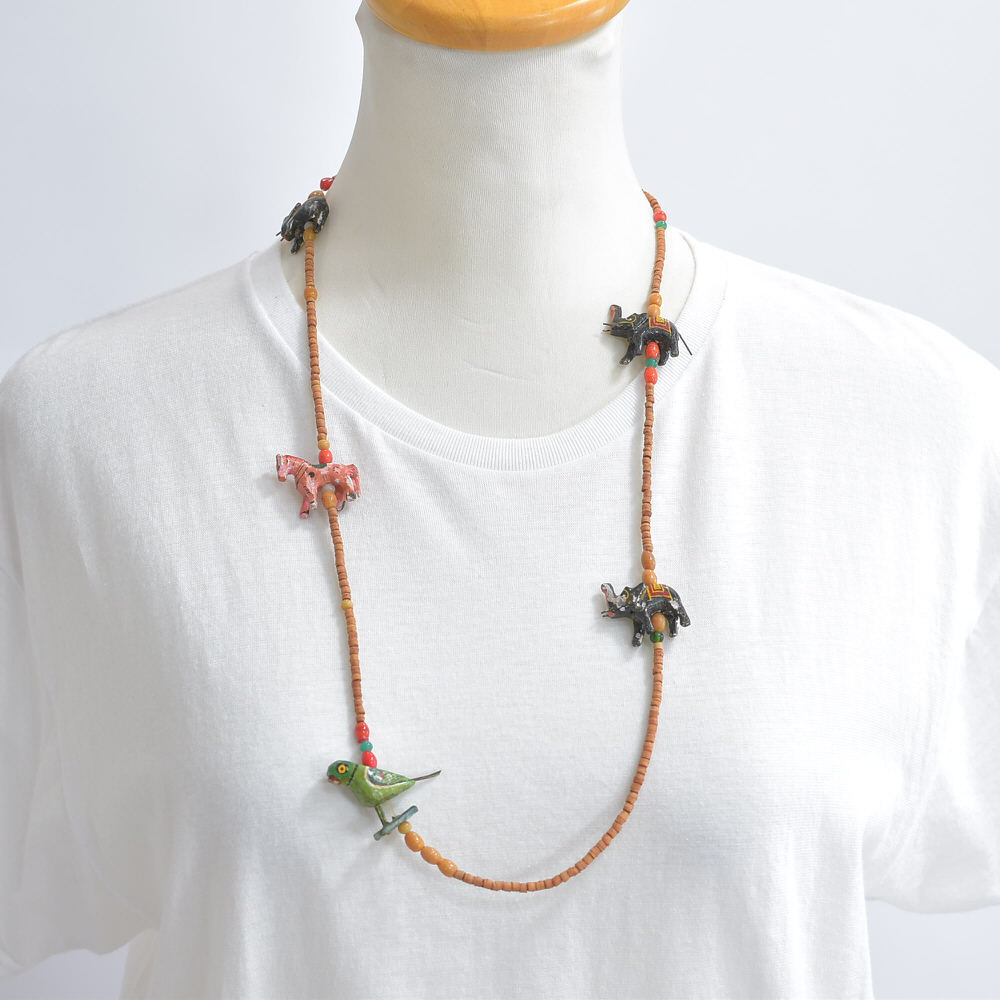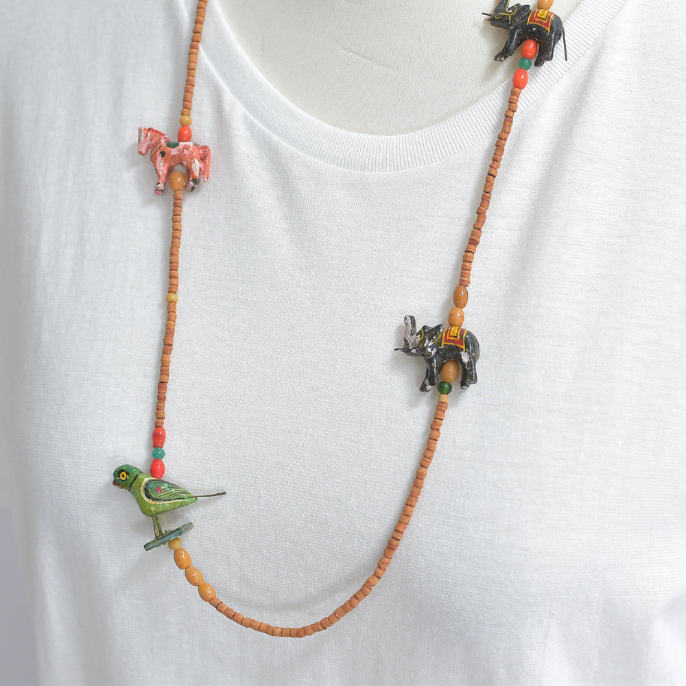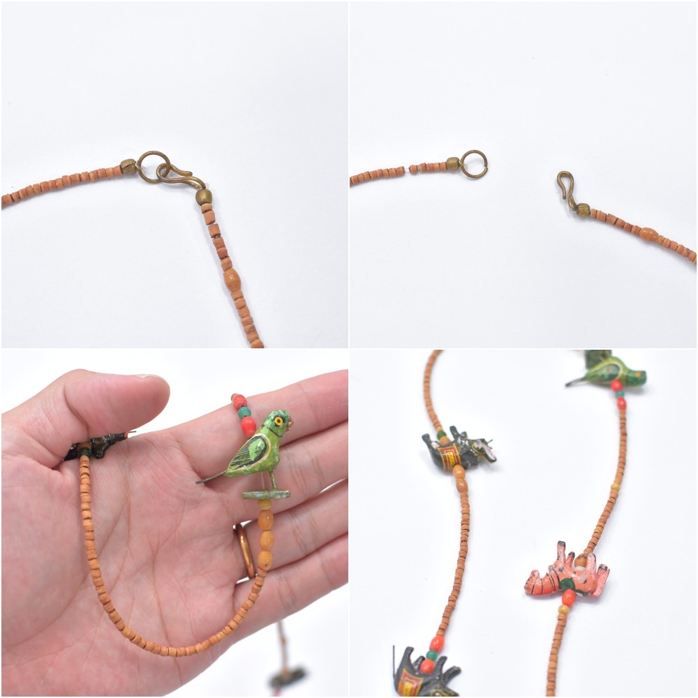 Used エスニックデザイン アニマルモチーフ ウッドビーズ ネックレス フォークアート 民族調 象 馬 鳥 ハンドクラフト ヴィンテージ ビンテージ 古着 ユニセックス