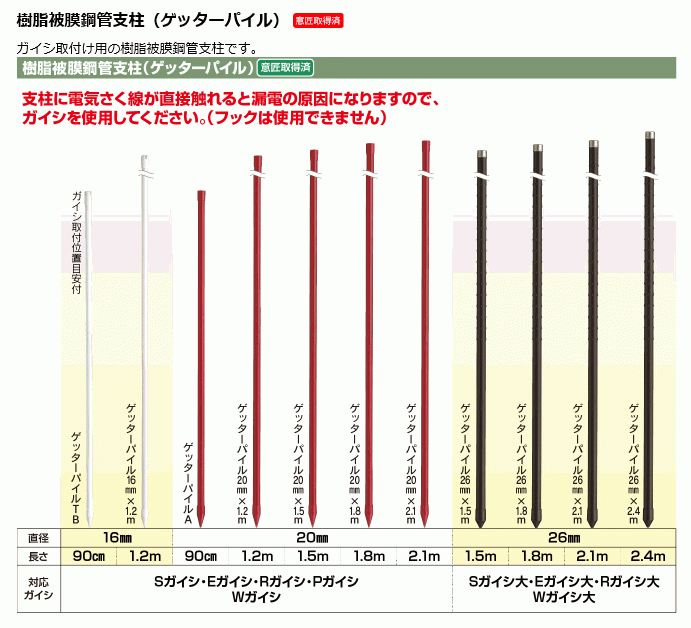 樹脂被膜鋼管支柱(ゲッターパイル)に柵線を取付ける際は、各支柱の直径に合ったガイシが 必要となります。※FRP用フックでは取付出来ませんのでお気を付け下さい。 |