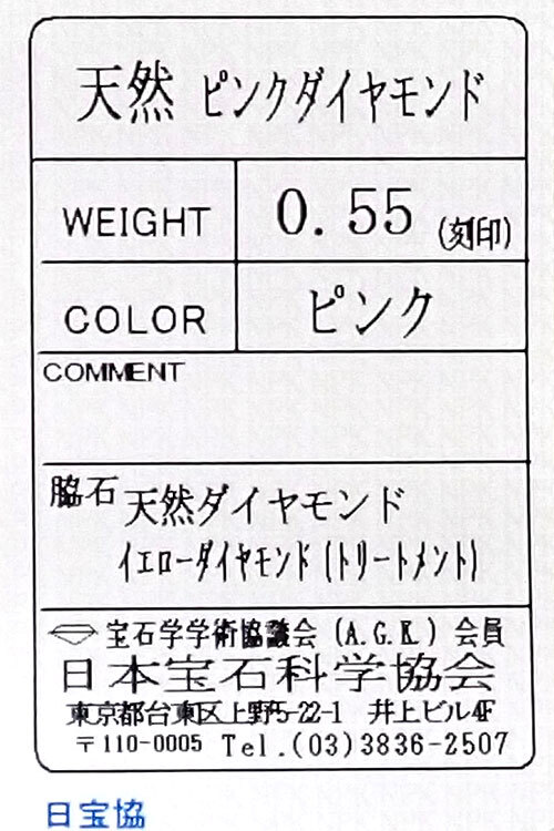 ダイヤモンド色:淡いピンク、濃いトリートイエロー、ほぼ無色に近い色合い