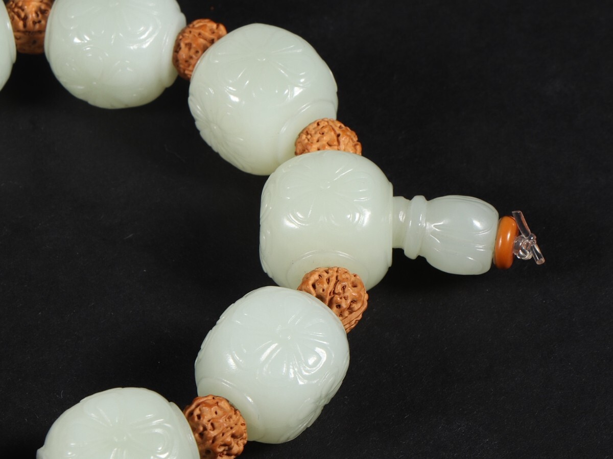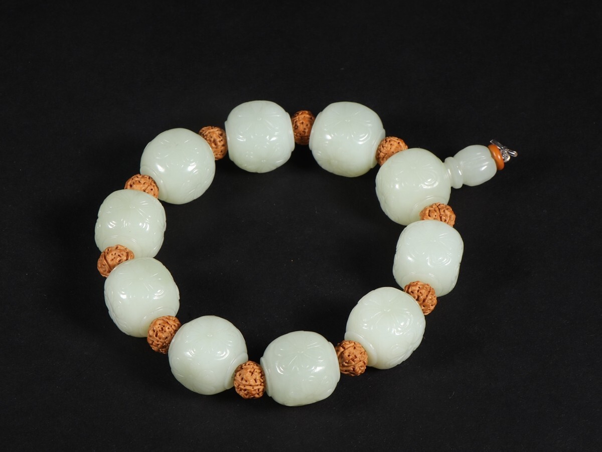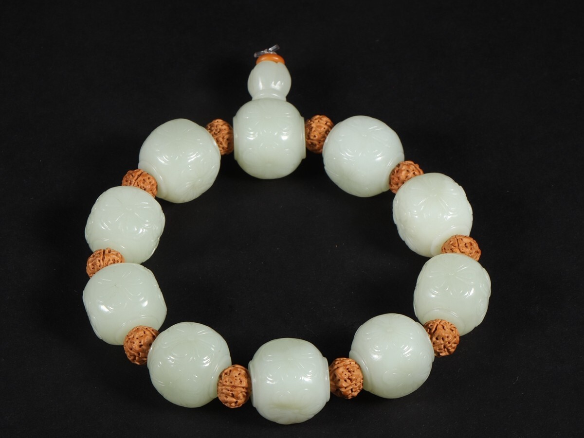【瓏】和田玉 子料彫 花卉紋 手串 清時代 極細工 手彫り 置物 裝身具 賞物 中国古美術 蔵出