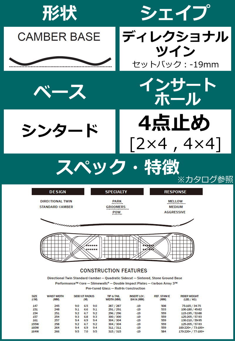 何でもできるボードを探し求めているなら、SHADOWBANこそ、その一本です。スタンダードなキャンバーとCarbon-Array-3の組み合わせは、板を硬くすることなく、必要な反発を与えてくれます。ストーングラインドで仕上げられたシンタードベースはワックスをしっかりと吸い、シーズンを通してよく走るでしょう。少しだけセットバックが入ったディレクショナルツインシェイプが、最大限のオールラウンド性能を発揮します。山のピークからパークまで、SHADOWBANは滑る場所を選びません。