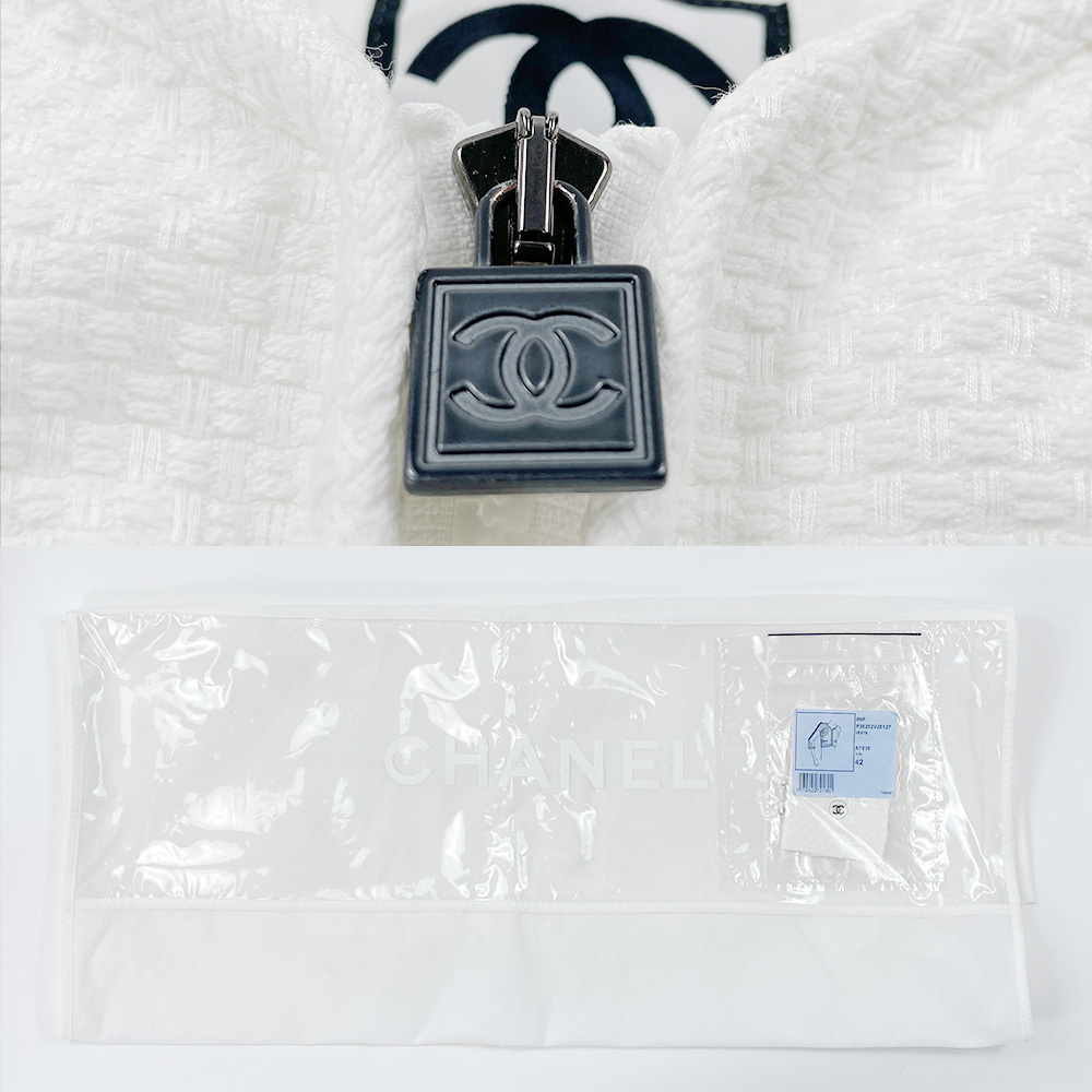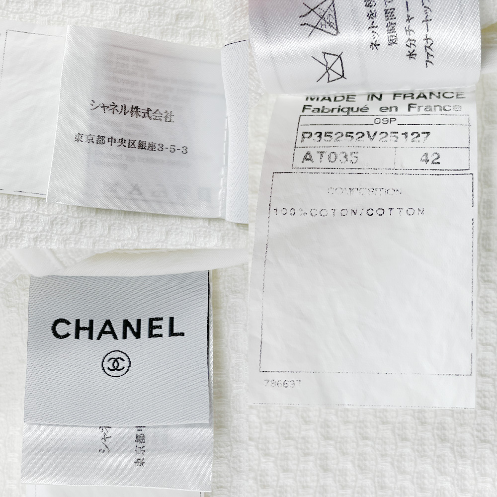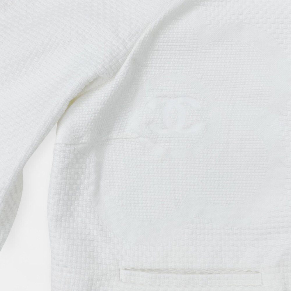 美品 CHANEL シャネル カメリア ココマーク ノーカラー コットン ジャケット 09P P3525 V25127 白 ホワイト 42 レディース アウター