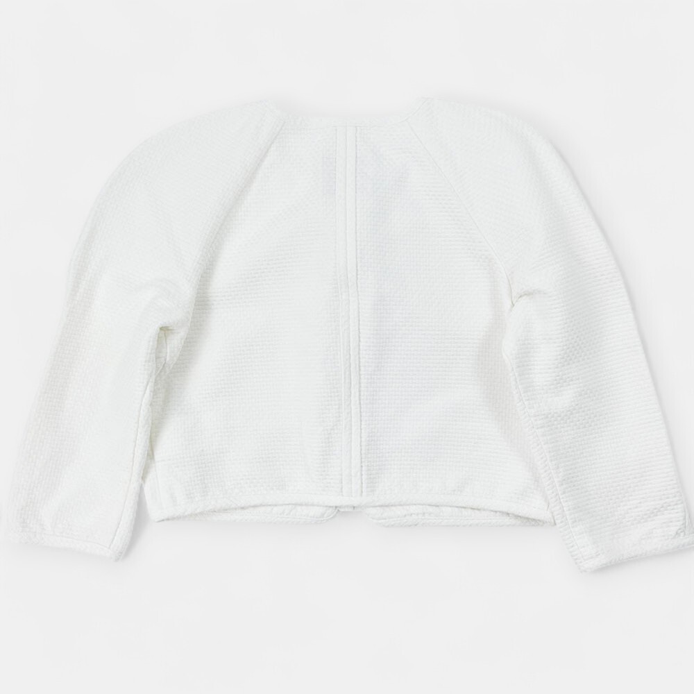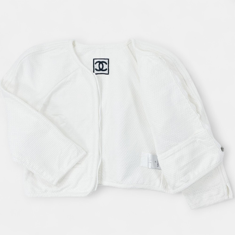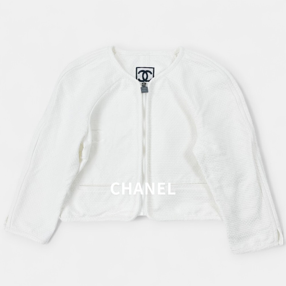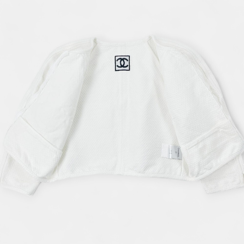 美品 CHANEL シャネル カメリア ココマーク ノーカラー コットン ジャケット 09P P3525 V25127 白 ホワイト 42 レディース アウター