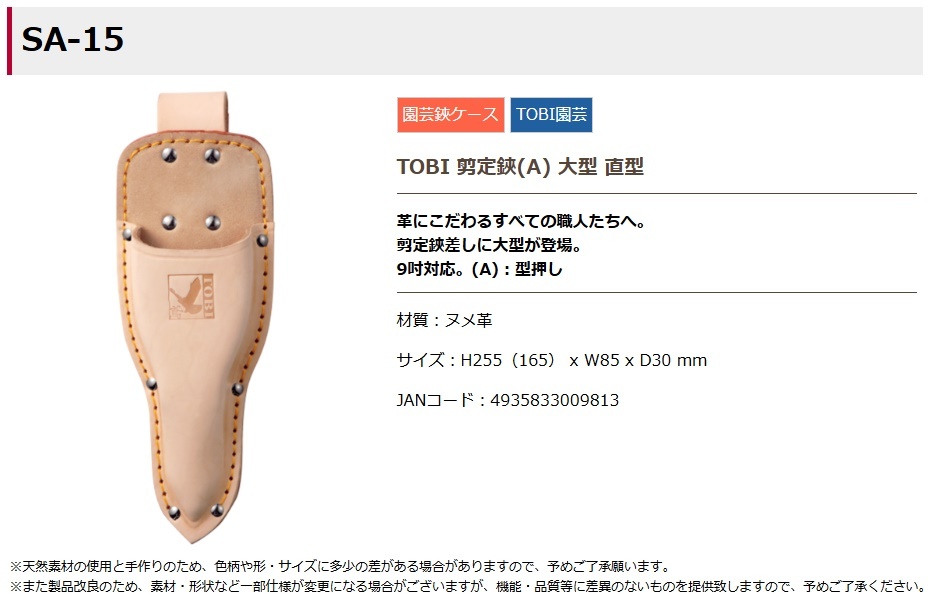 ふくろ倶楽部 FUKURO CLUBTOBI 剪定鋏(A) 大型 直型SA-15■特長革にこだわるすべての職人たちへ。剪定鋏差しに大型が登場。9吋対応。(A):型押し■仕様・材質:ヌメ革・サイズ:H255(165)xW85xD30mm※天然素材の使用と手作りのため、色柄や形・サイズに多少の差がある場合がありますので、予めご了承願います。※また製品改良のため、素材・形状など一部仕様が変更になる場合がございますが、機能・品質等に差異のないものを提供致しますので、予めご了承ください。
