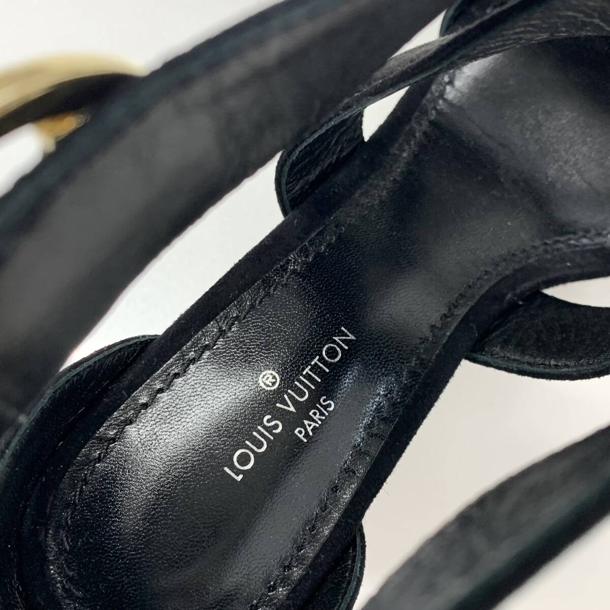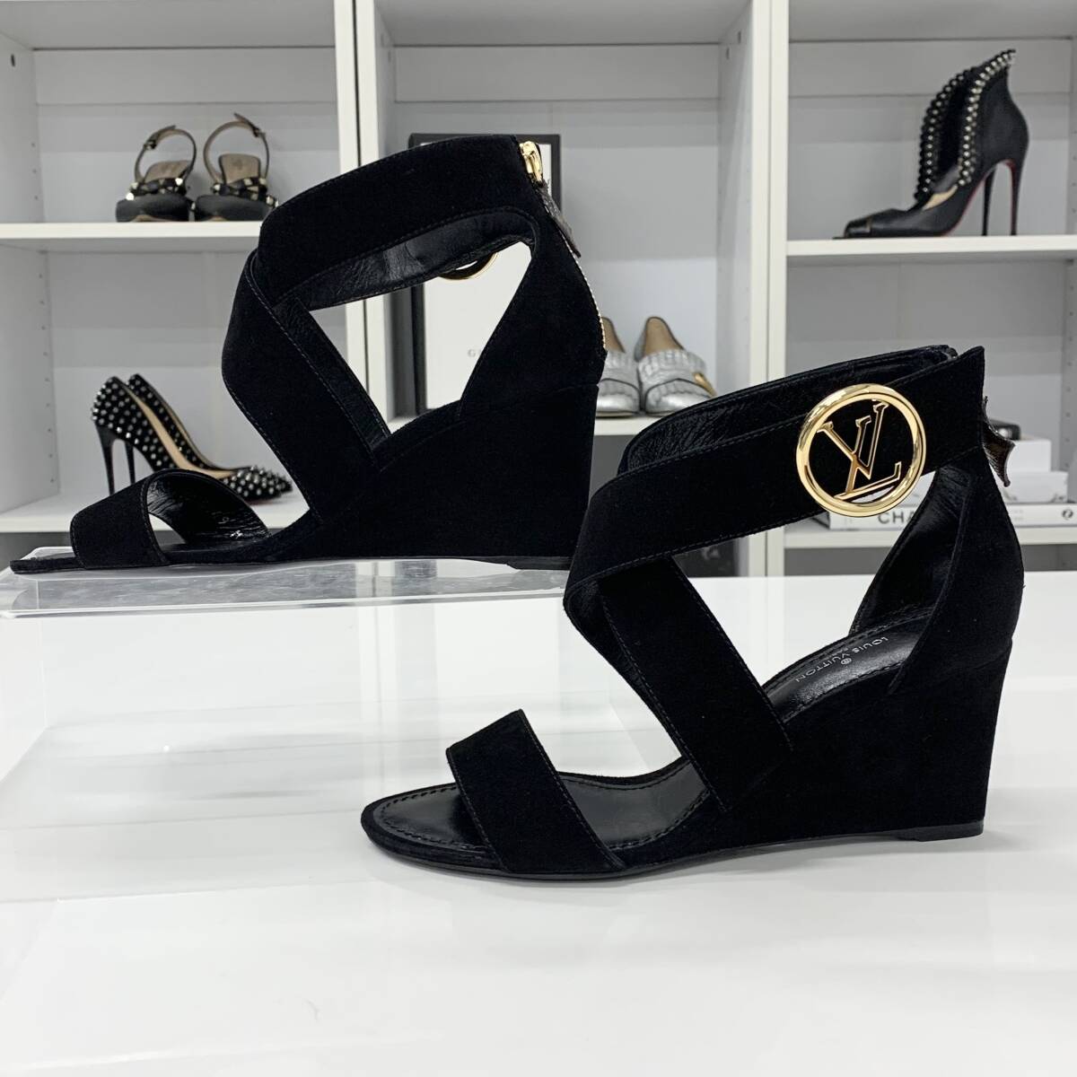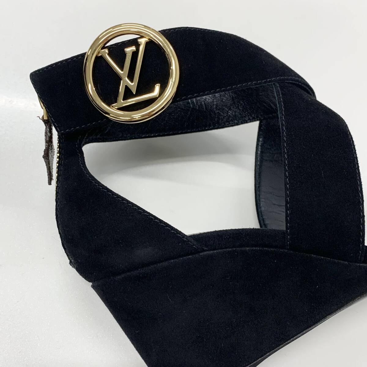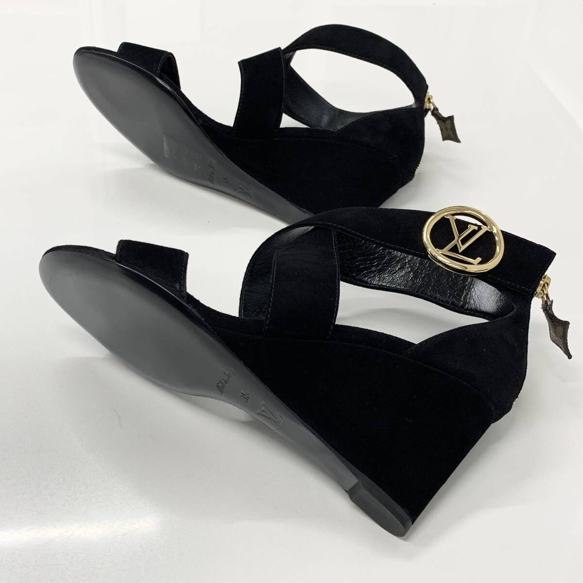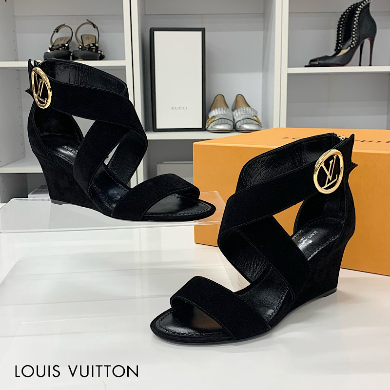 未使用 ヴィトン ホライズンライン スエード LV金具 ウェッジソール サンダル ブラック