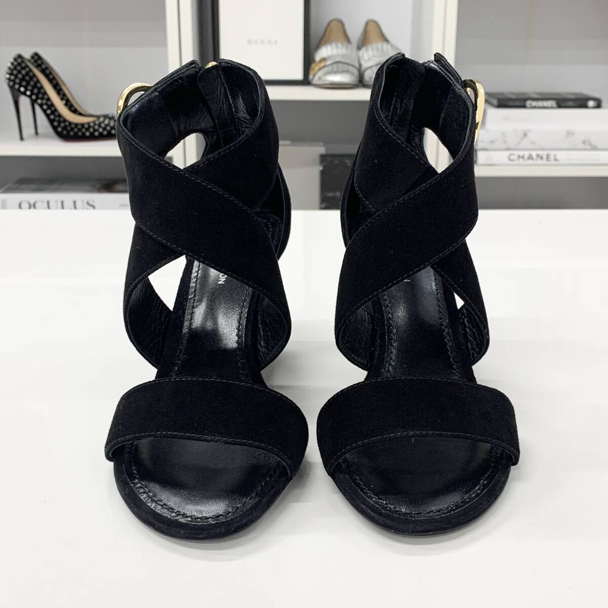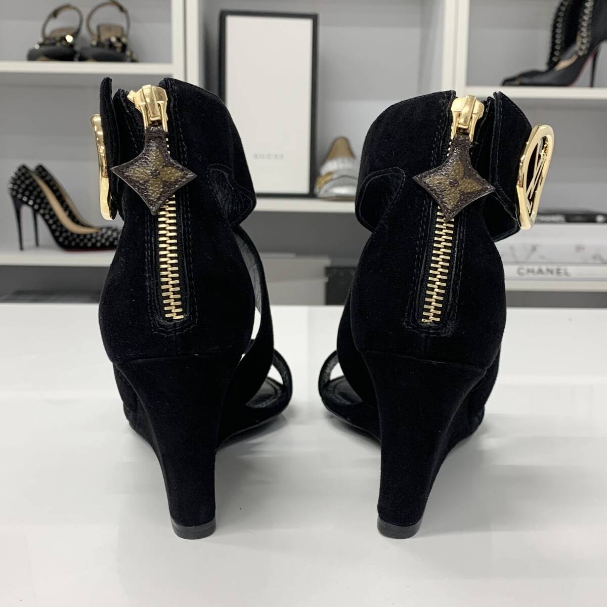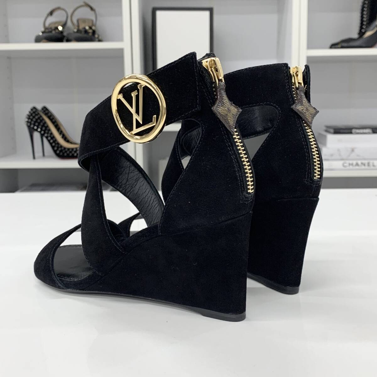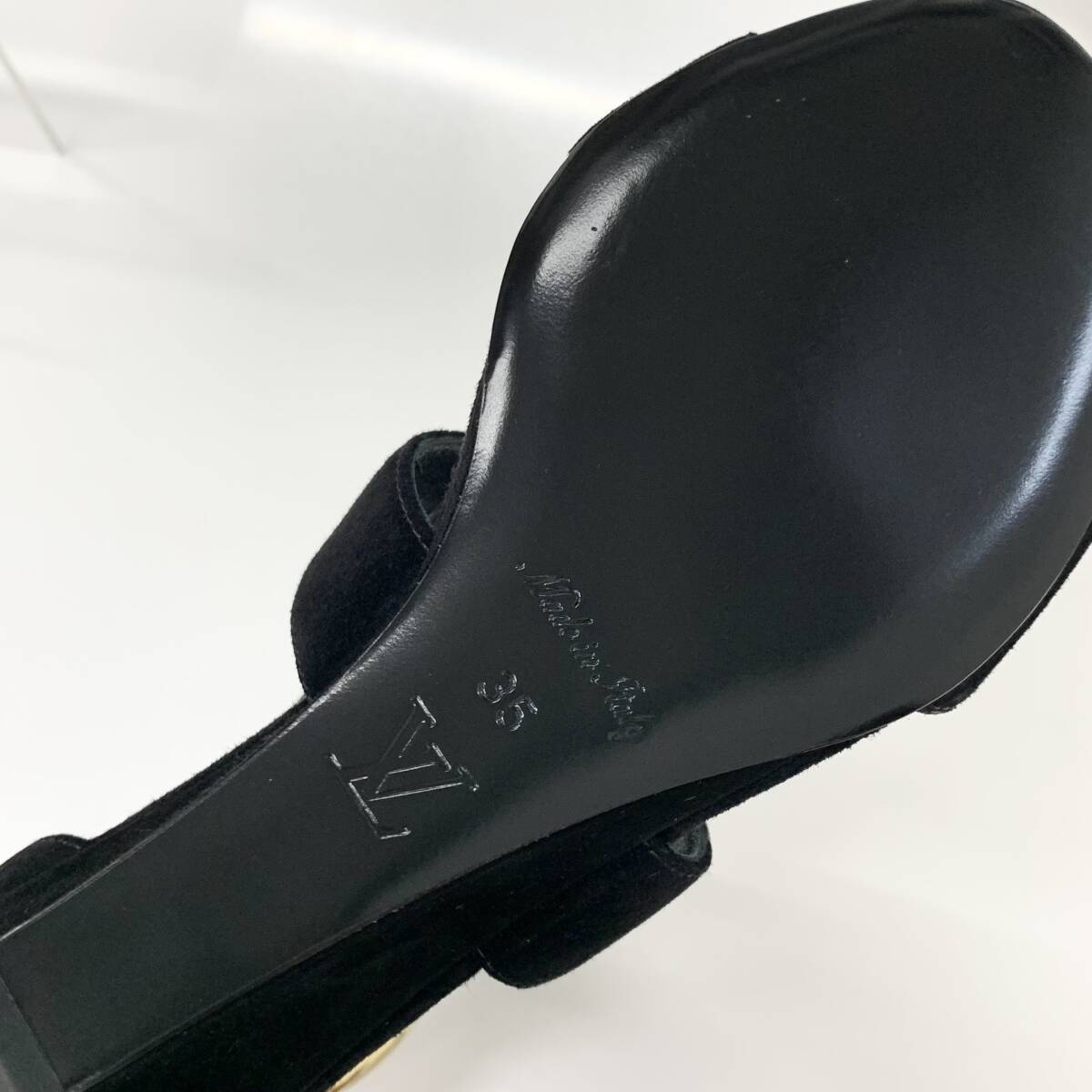 未使用 ヴィトン ホライズンライン スエード LV金具 ウェッジソール サンダル ブラック