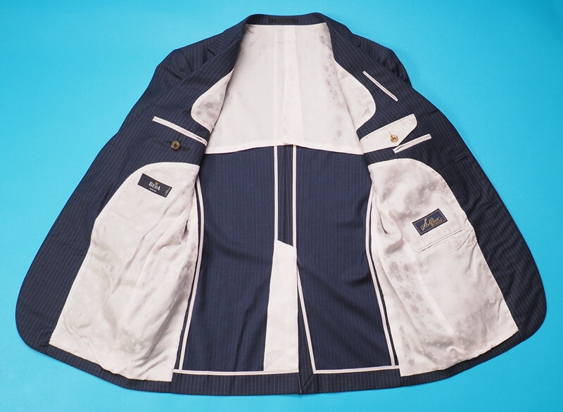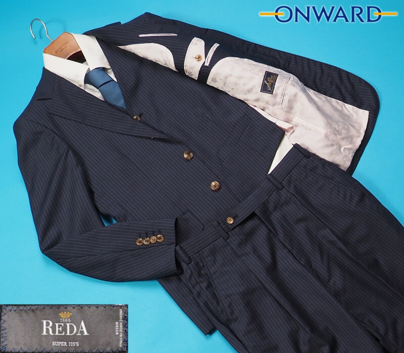 新品19.1万円 オンワード樫山 Selflex 日本製 春夏『REDA レダ 伊製生地』Super130Sウール ストライプ スリーピーススーツY92(A5)紺 851226