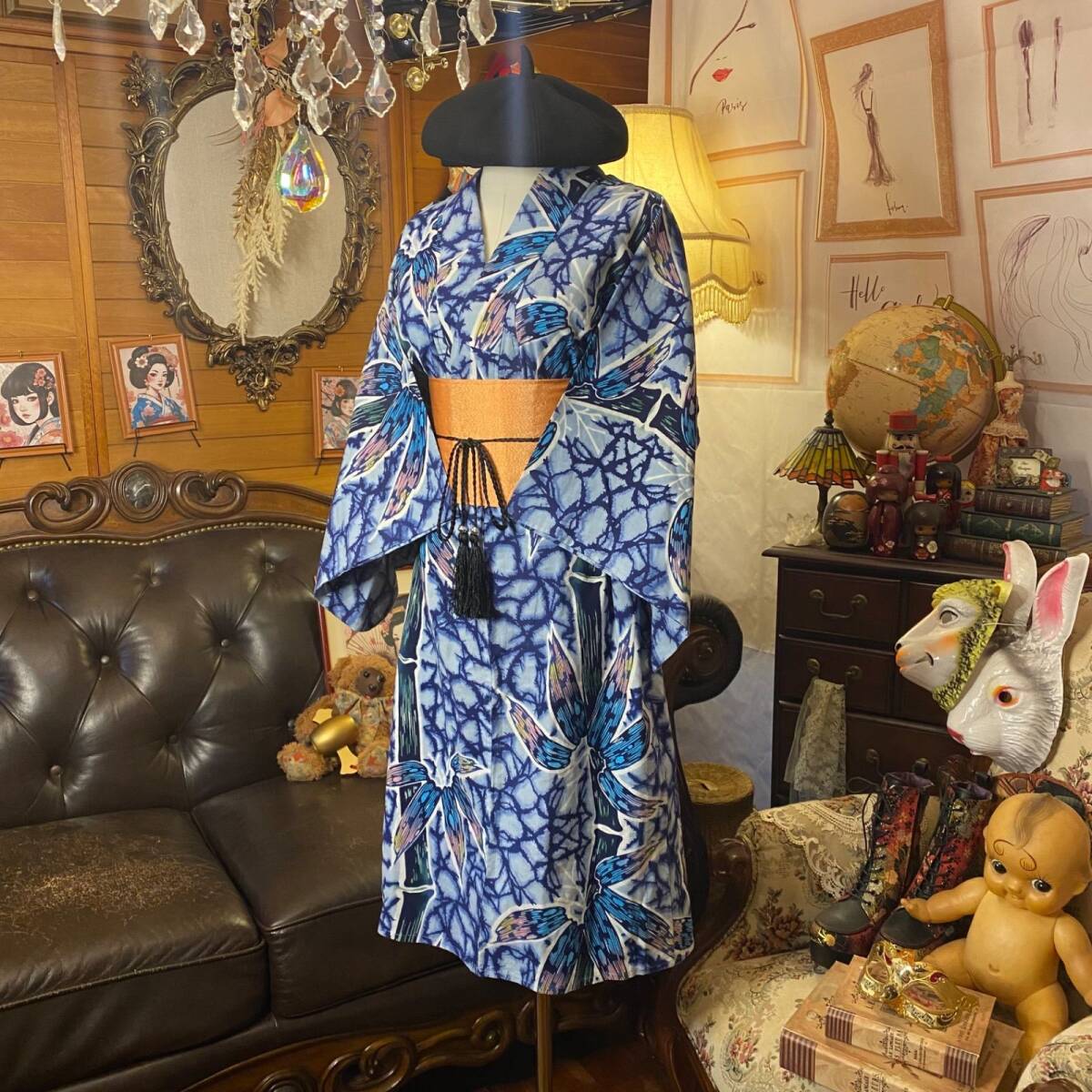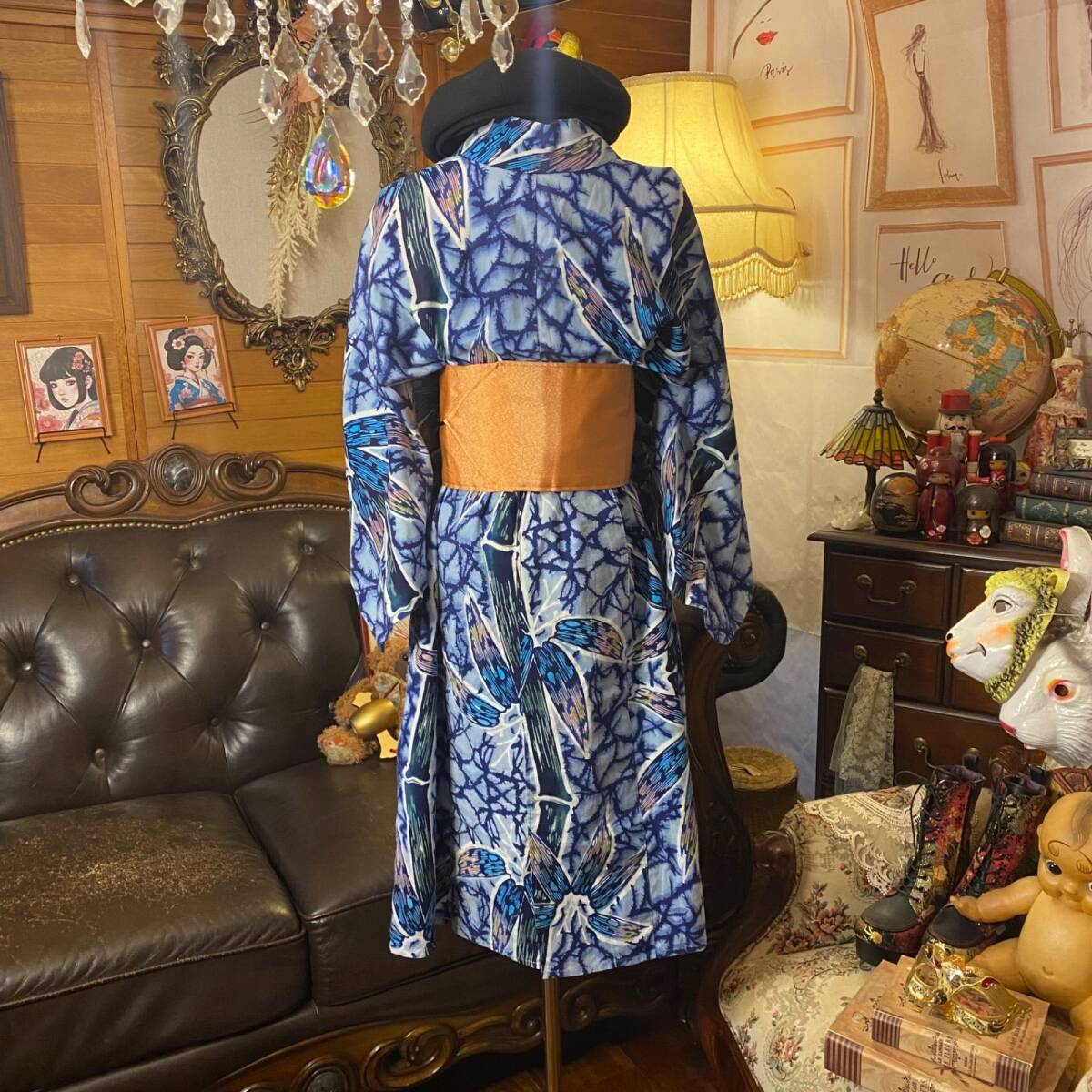【浴衣リメイク ワンピース/ドレス/帯サッシュベルト 和洋折衷 レトロ 古着 ハンドメイド 群青から薄藍へと揺らぐ絞り調の地に、筆致豊かな竹葉が広がる W-639】