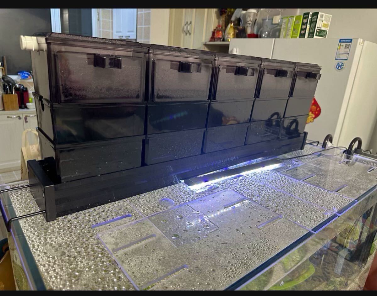 商品では三段階濾過(上は物理濾過、真中は生物濾過、下沈澱槽)2層トリクルフィルターはオールインワンフィルターです。 濾過槽の上層は物理濾過層で、濾過マット入れます