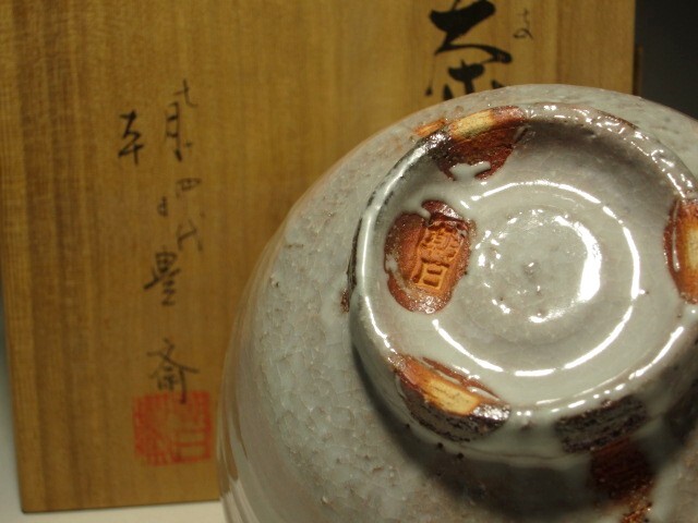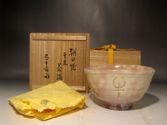 朝日豊斎作、 茶碗です。 大変趣のある作品です。 高台脇に銘があります。 久保田流十二代 尋牛斎花押があります。