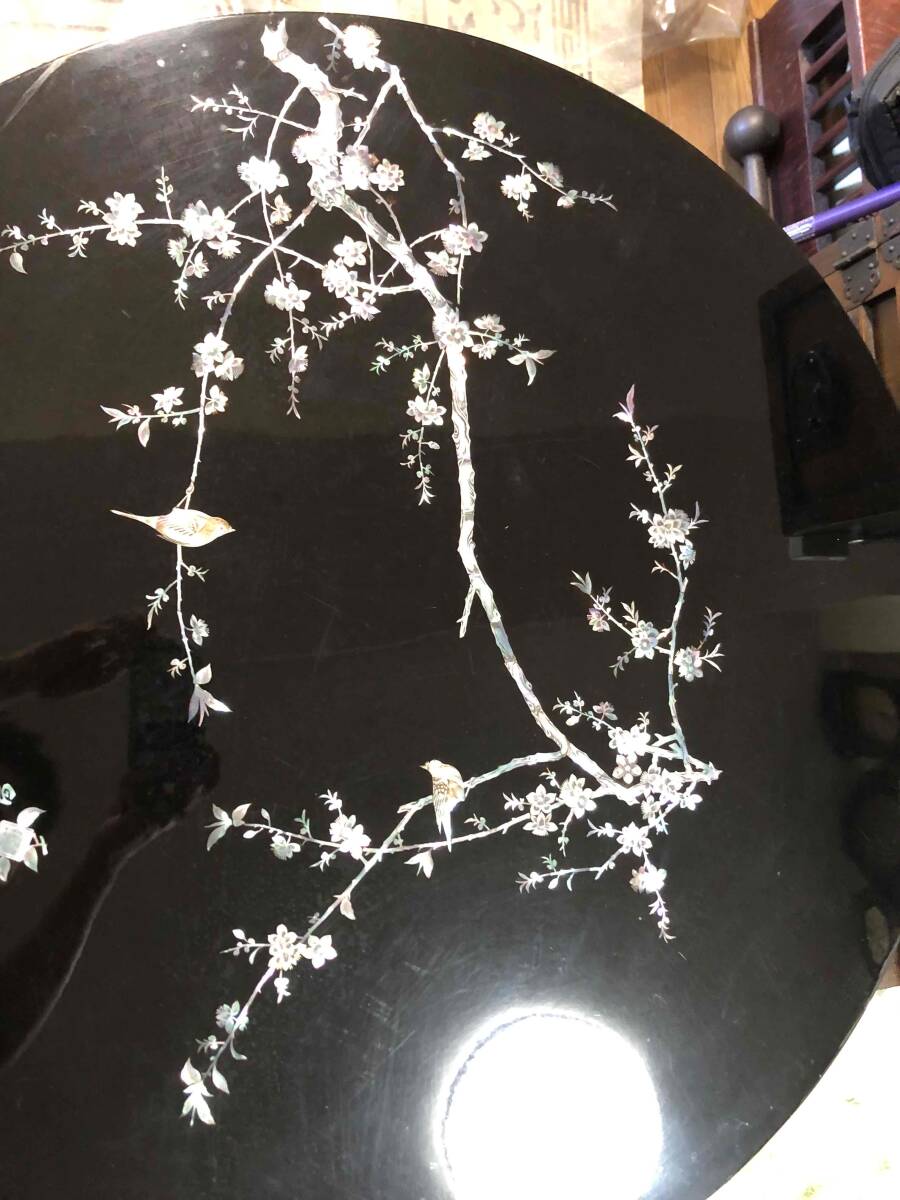 「【漆塗り 螺鈿細工 円卓】梅と小鳥図/成澤出昌 銘あり/黒漆 和風?朝鮮?中国?アンティーク 丸卓 座卓【直接引き取り限定】」になります。