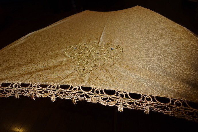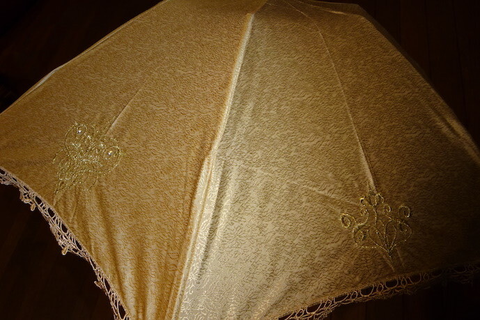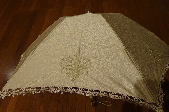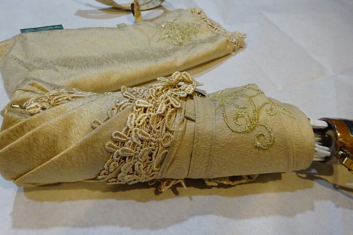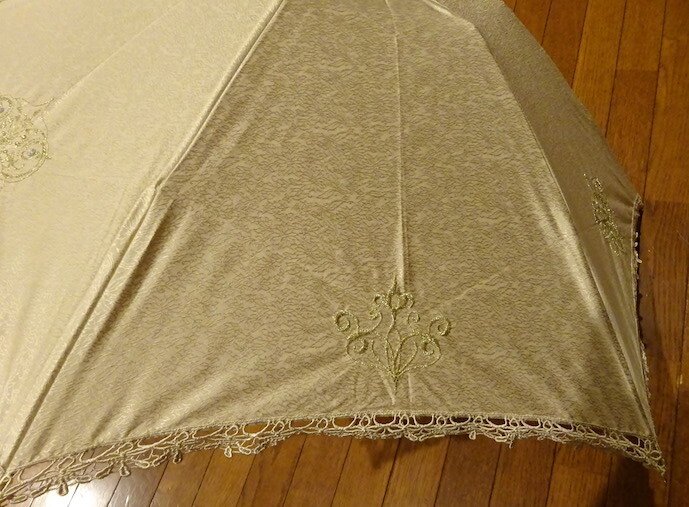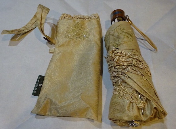 キラキラ金色の地模様と刺繍が豪華なNational Trust の折りたたみパラソルです。