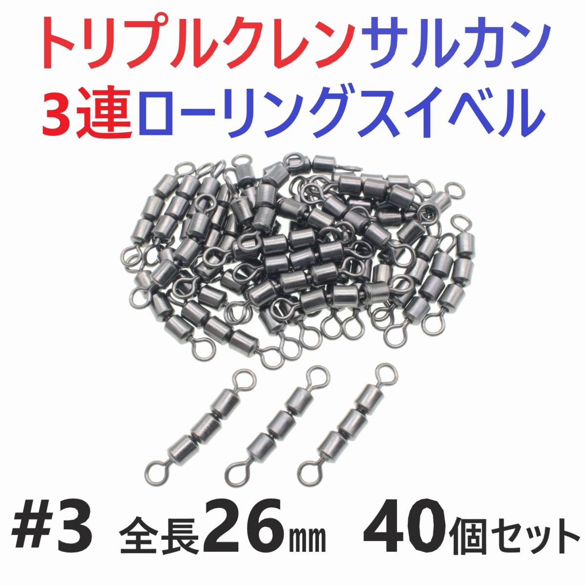 【送料無料】トリプルクレン サルカン 3連 ローリングスイベル #3 全長26㎜ 強度40㎏ 40個セット 強力ヨリモドシ 超回転で糸ヨリ解消!
