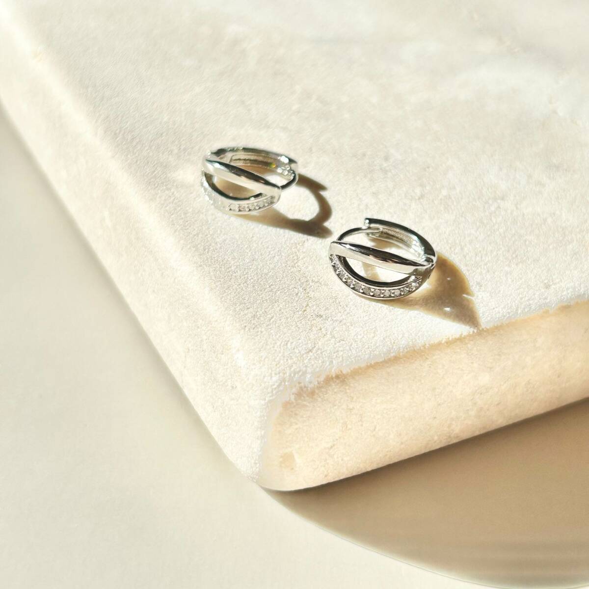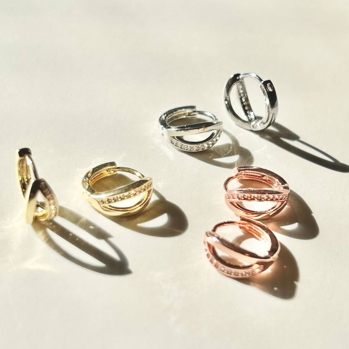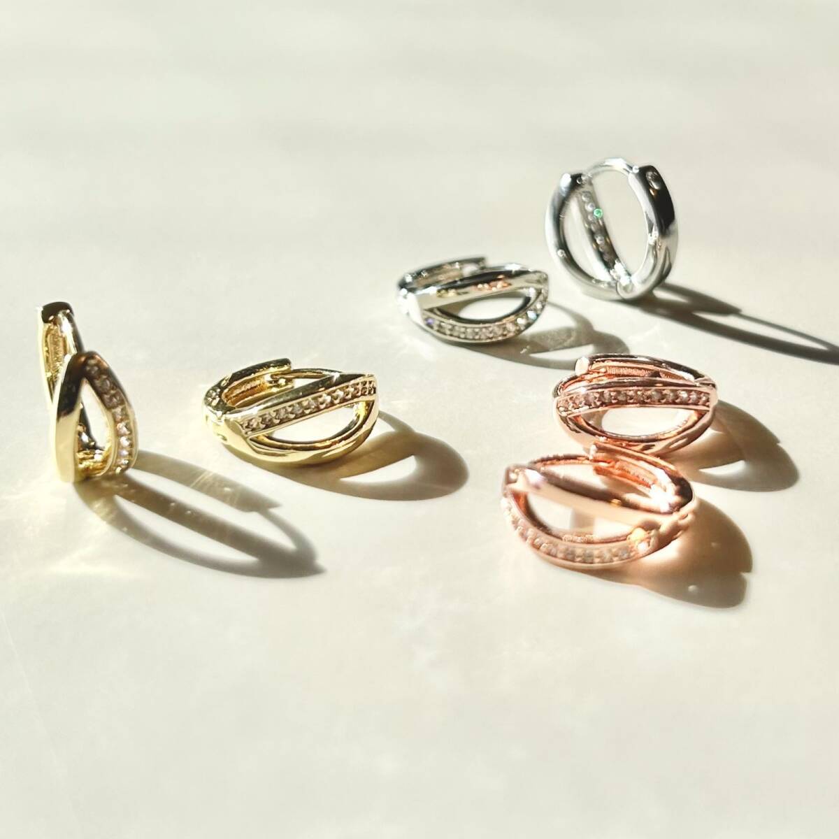 2本のラインが組み合わさった、ジルコニアがキラキラと輝くフープピアスです。