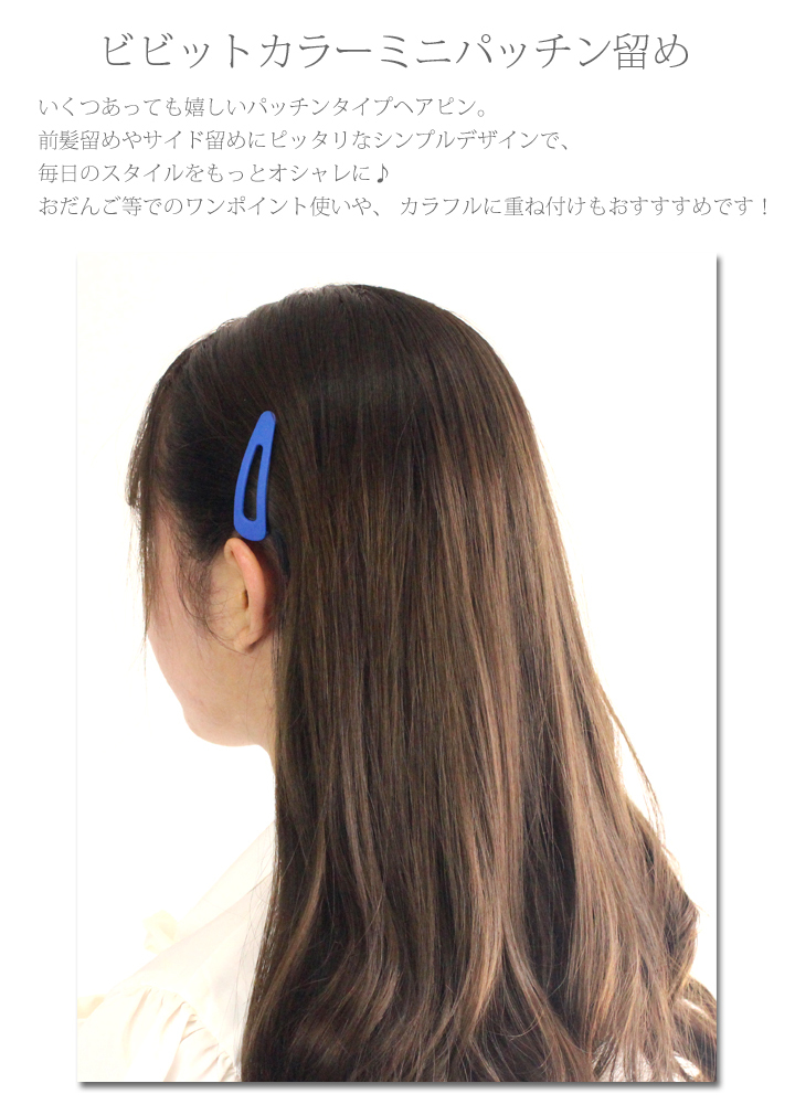 商品説明 | いくつあっても嬉しいパッチンタイプヘアピン。 前髪留めやサイド留めにピッタリなシンプルデザインで、毎日のスタイルをもっとオシャレに♪ おだんご等でのワンポイント使いや、カラフルに重ね付けもおすすすめです^-^ |