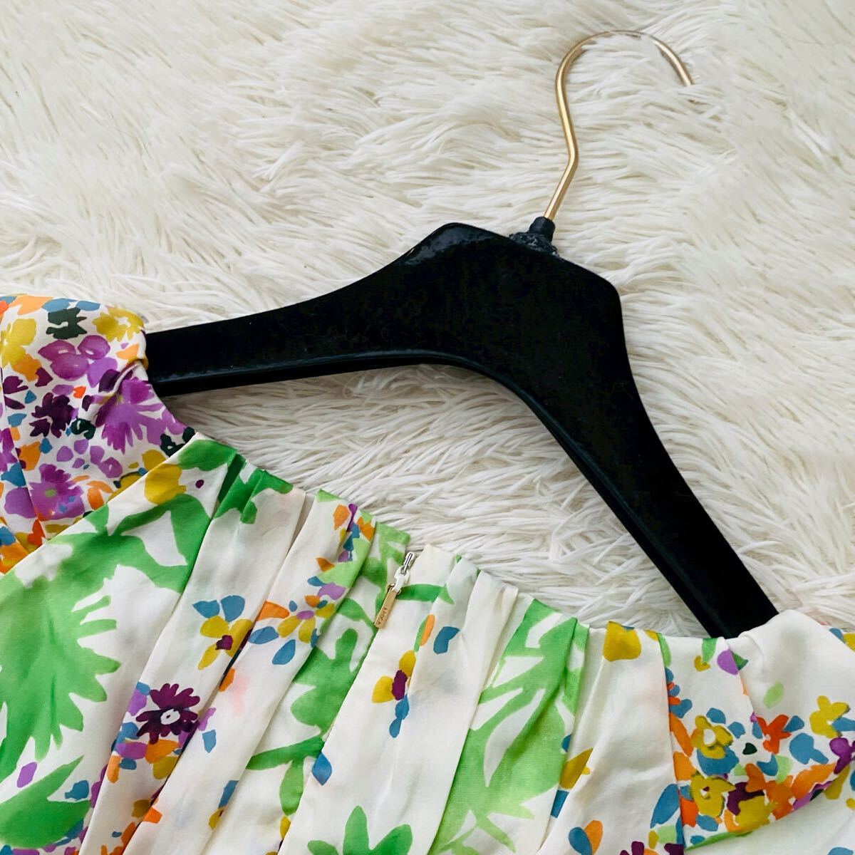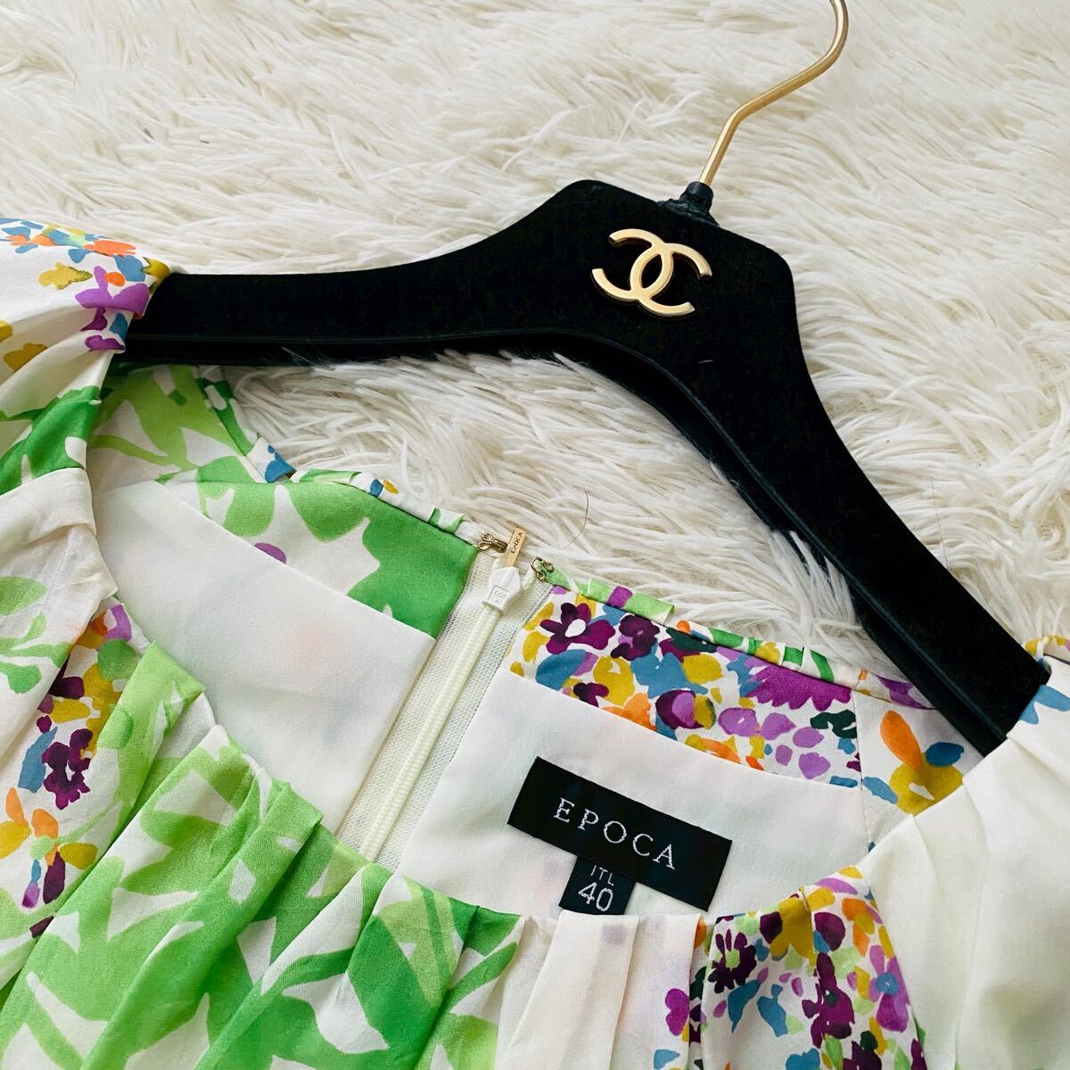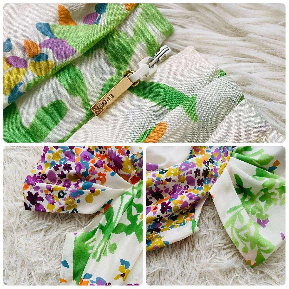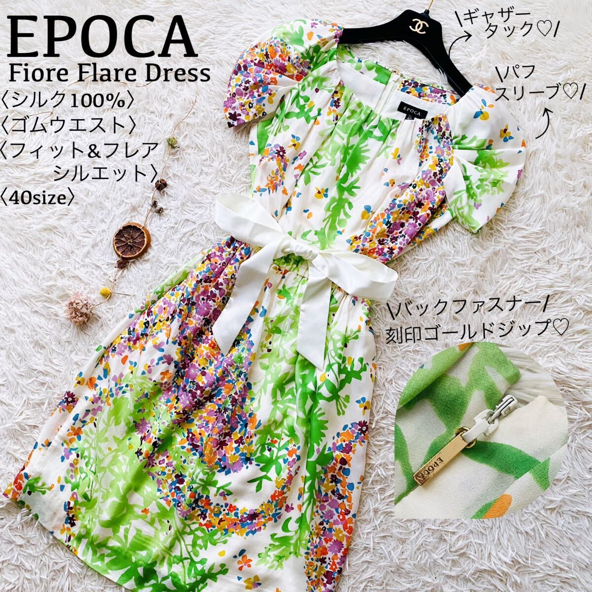 *EPOCAの花とリーフをモチーフにナチュラルタッチで描いた総柄フレアドレス。上品な光沢感がある高級シルクを100%使用、清涼感がありシルク特有の自然なドレープが映える素材が特徴。