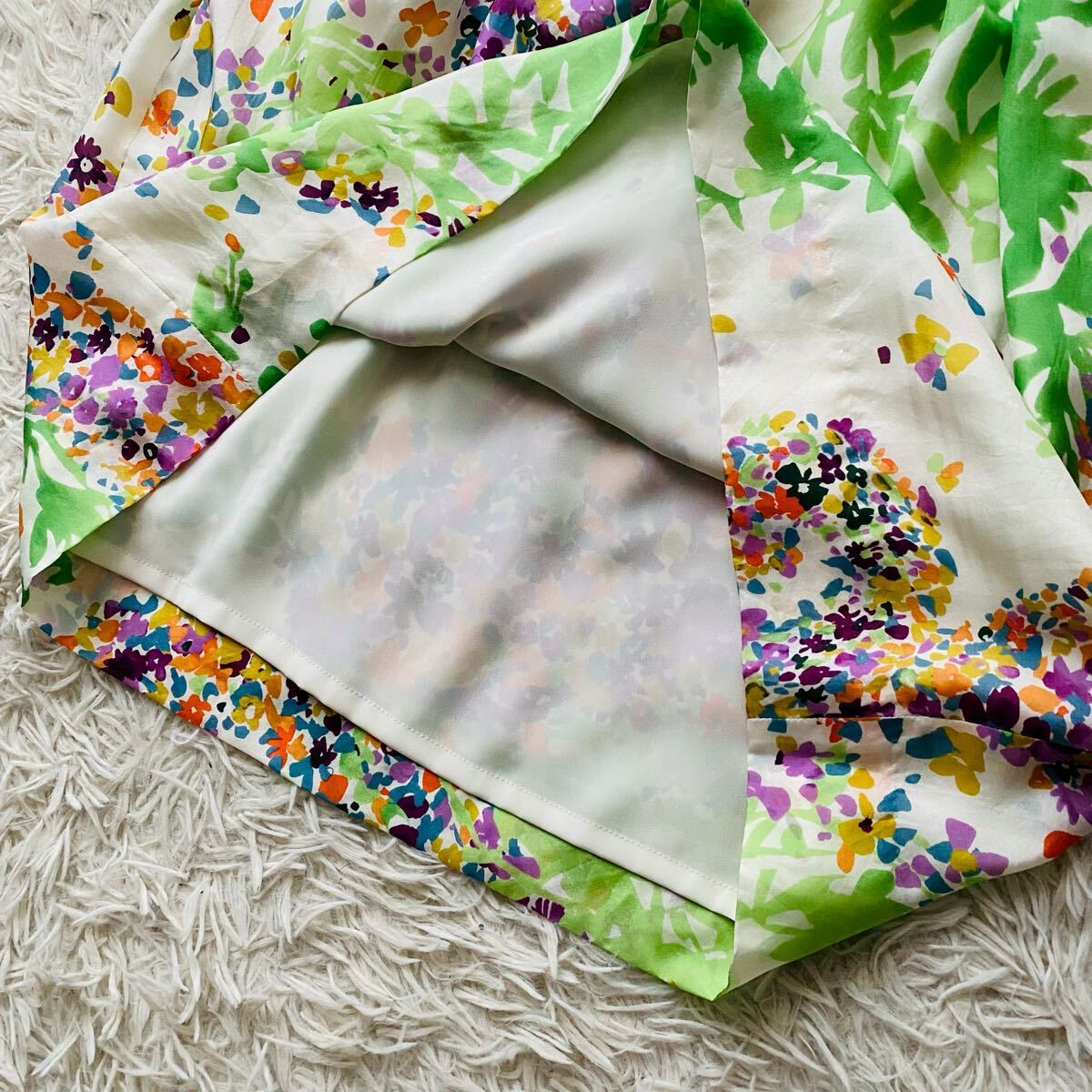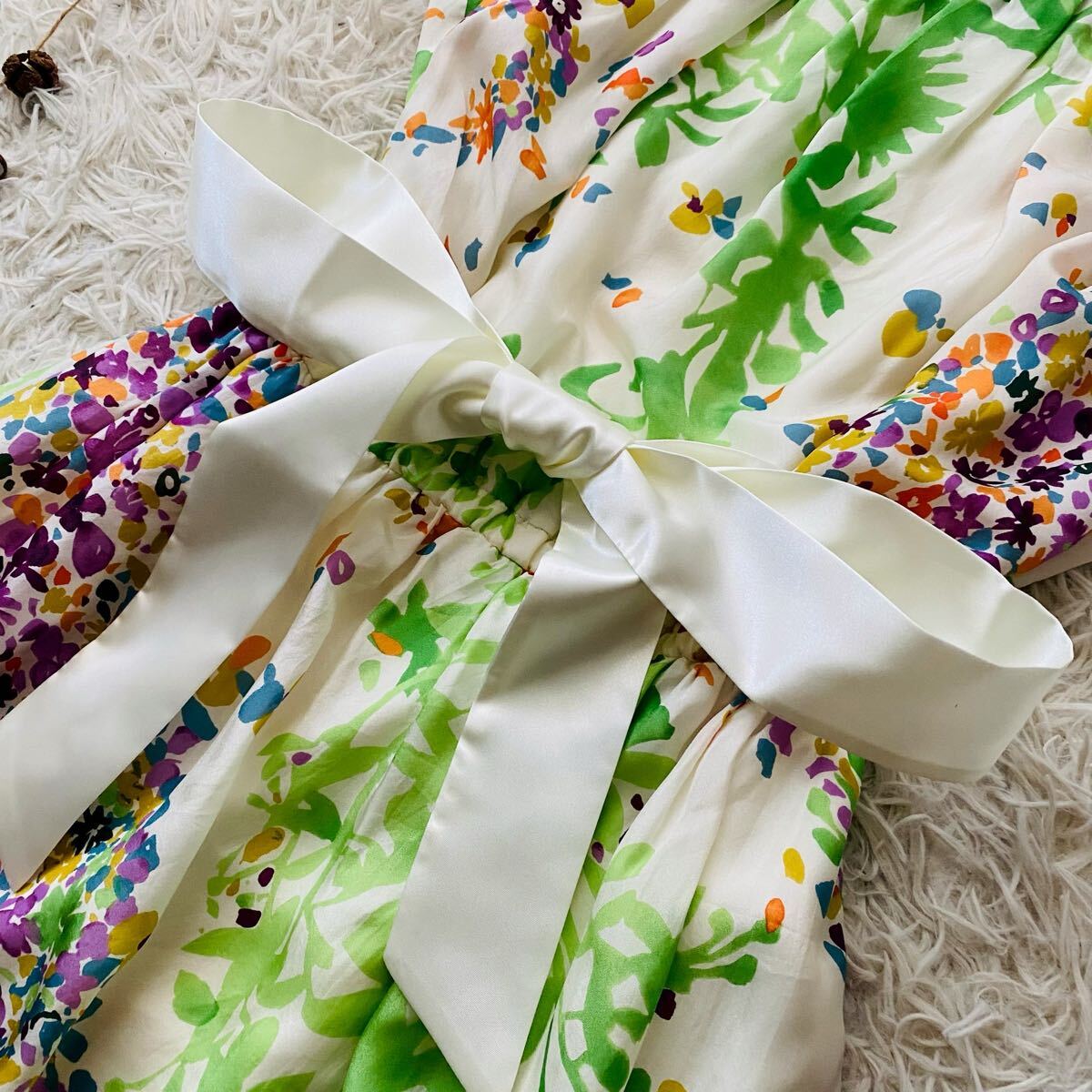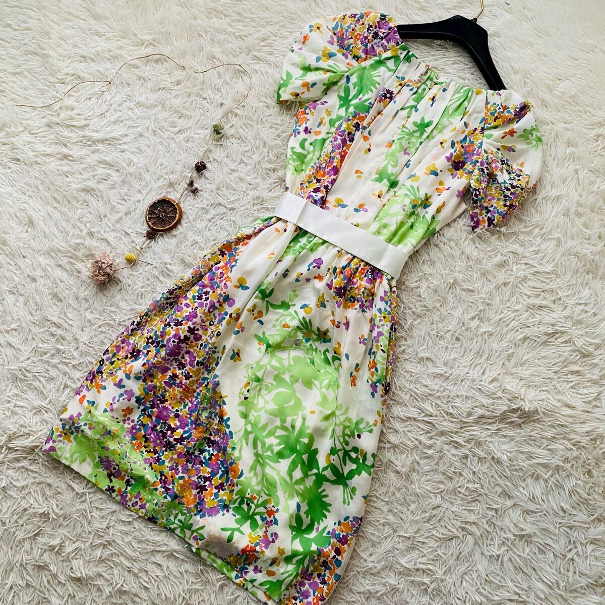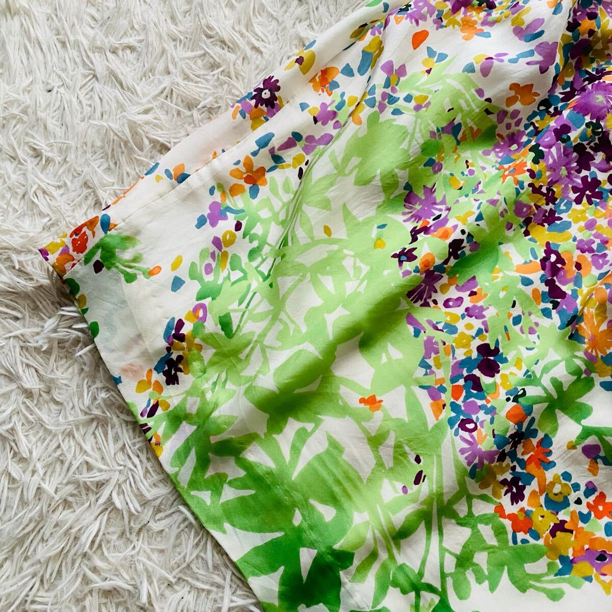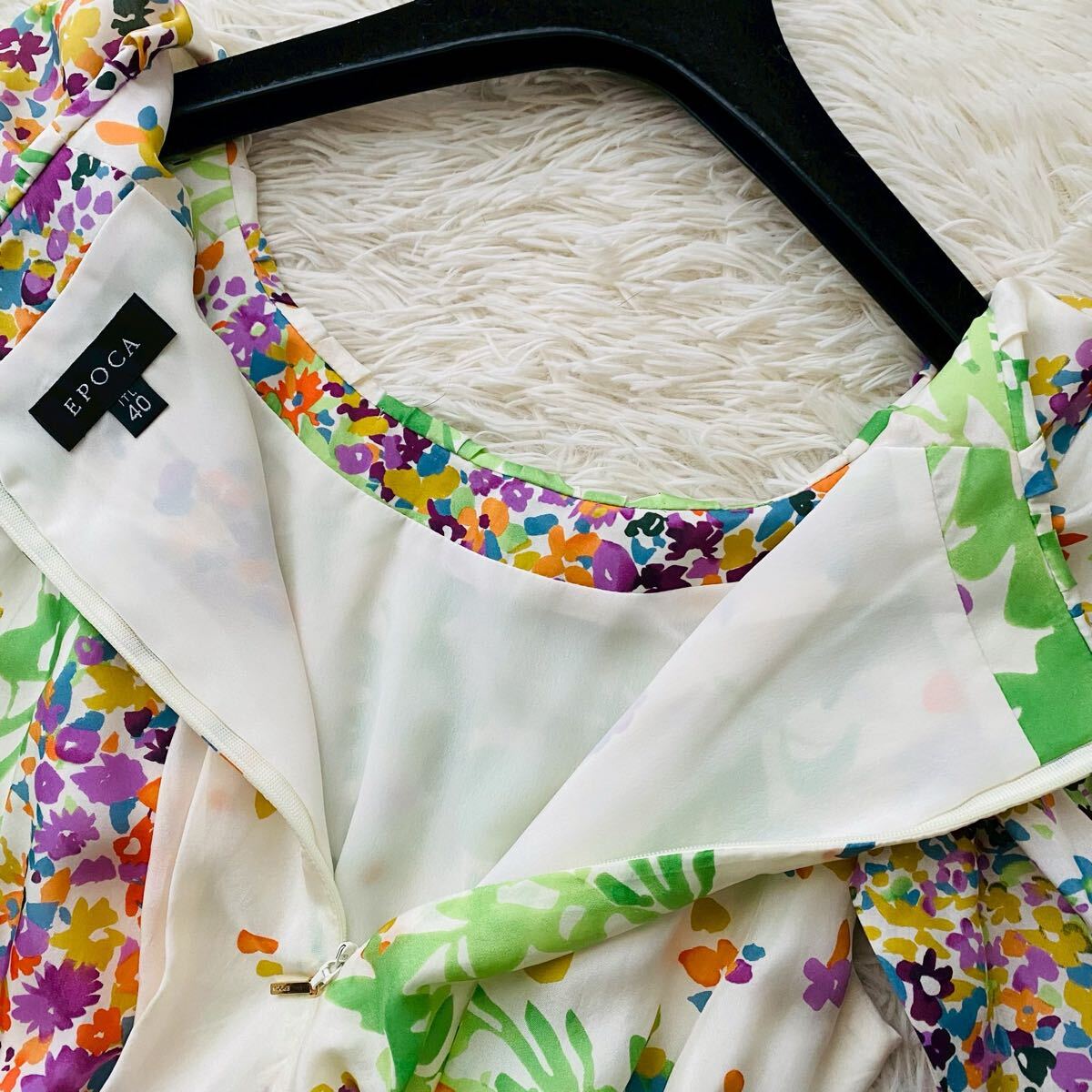 *EPOCAの花とリーフをモチーフにナチュラルタッチで描いた総柄フレアドレス。上品な光沢感がある高級シルクを100%使用、清涼感がありシルク特有の自然なドレープが映える素材が特徴。