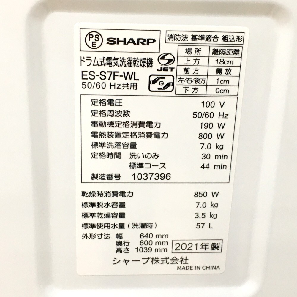 | ■●【同梱不可】【家財便C】中古品 SHARP シャープ ES-S7F-WL ホワイト系 ドラム式洗濯乾燥機 左開き 洗濯7kg 乾燥機3.5kg 2021年製 | |