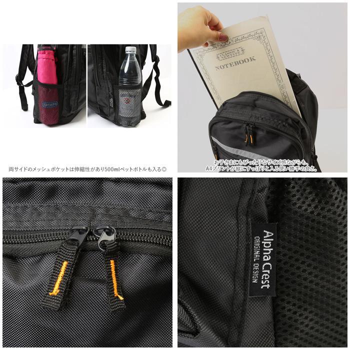 商品説明 | ・・夜道でも安心な反射テープ付き!コンパクトサイズの「Alpha Crest 反射テープ付きデイパック」が発売♪ ・お子さまにもぴったりなサイズ感ながらも、A4プリントが縦にすっぽりと入る使い勝手の良さ。 ・フロントには小物を分けて入れられるファスナーポケット×2装備。 ・両サイドのメッシュポケットは伸縮性があり500mlペットボトルも入る◎ ・男女、年代関係なく使えるベーシックなカラーバリエーション! |