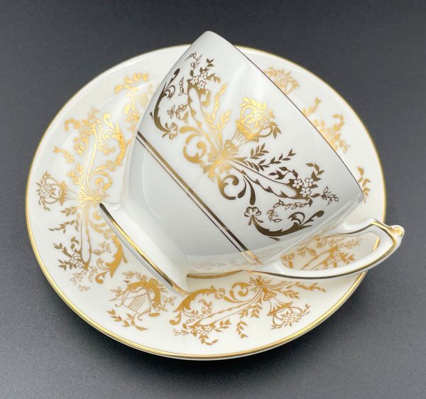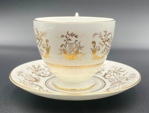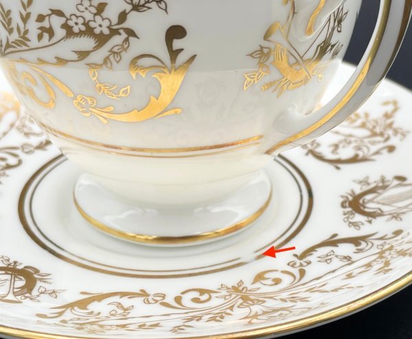 とりわけハンドルの曲線美と、そこに添えられた金彩の装飾は、英国磁器の高い技術と美意識を象徴する要素といえるでしょう。