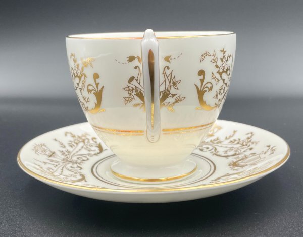 飲み口の縁や持ち手の縁取り、さらにはソーサーの内縁部や外周に至るまで、すべてのラインに金彩が用いられており、細部まで丁寧に仕上げられた逸品です。