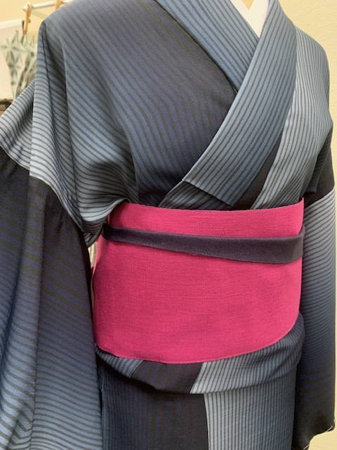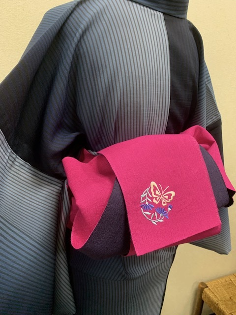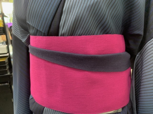 両方の色が楽しめて、浴衣や着物に合わせやすい便利な帯です。